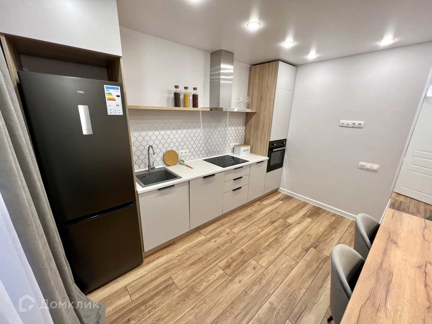 Натяжные потолки, ламинат на полу, качественные межкомнатные двери. Есть большая застекленная лоджия с выходом из кухни.