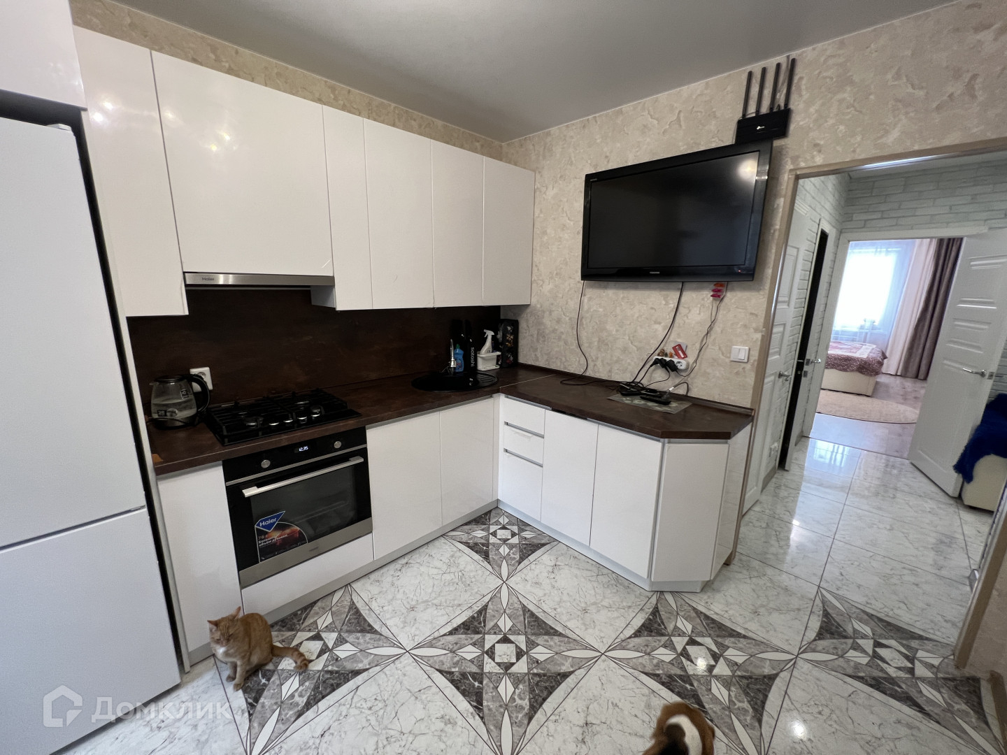 В подарок остается кухонный гарнитур со встроенной техникой (духовой шкаф, варочная панель, посудомоечная машина).