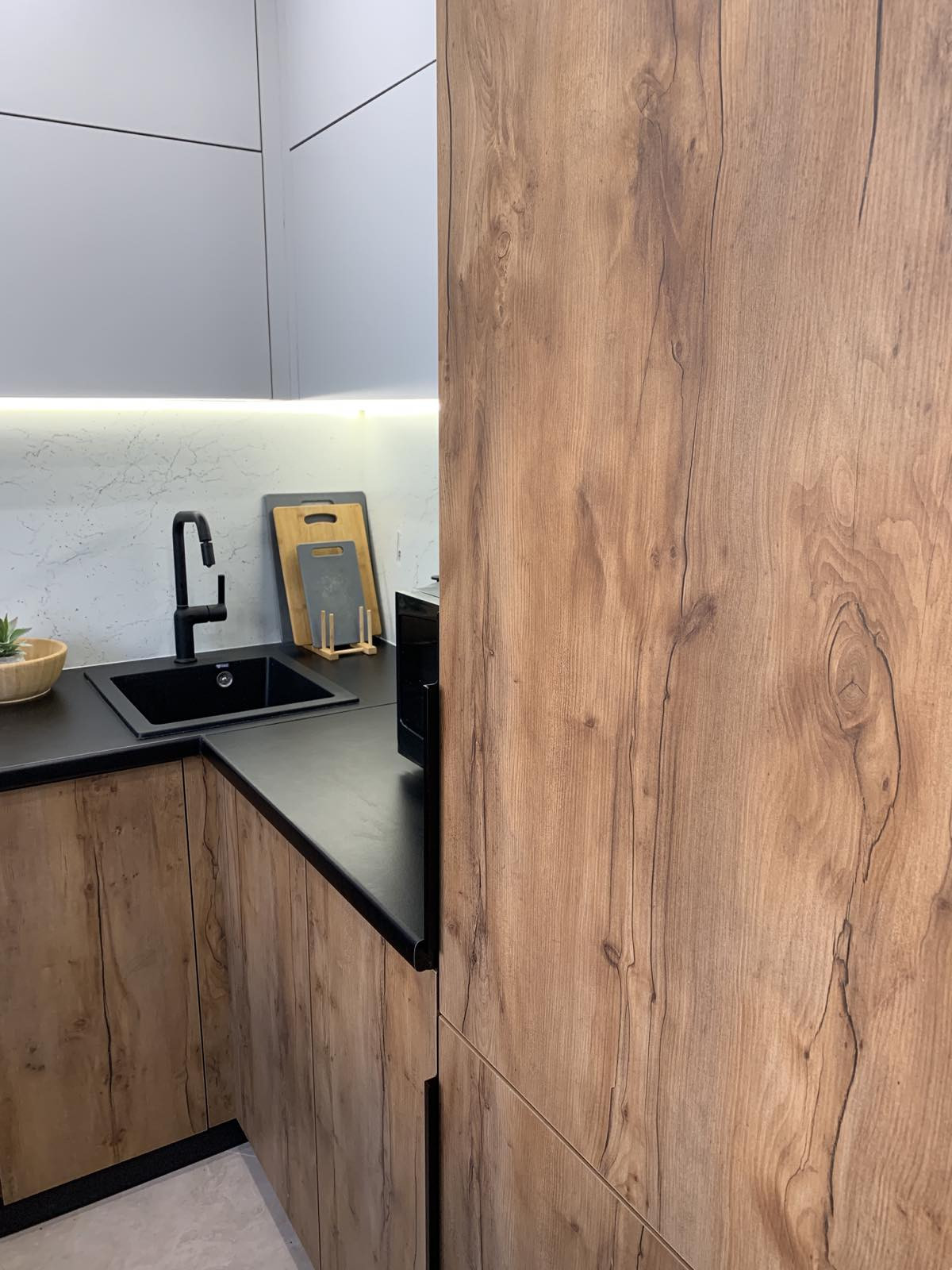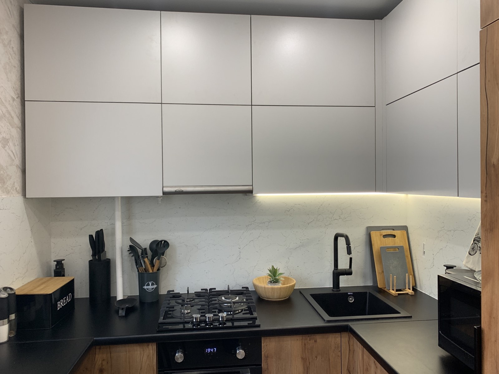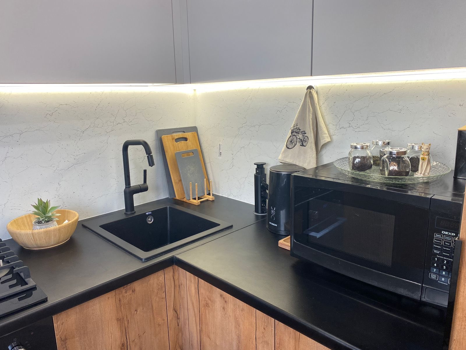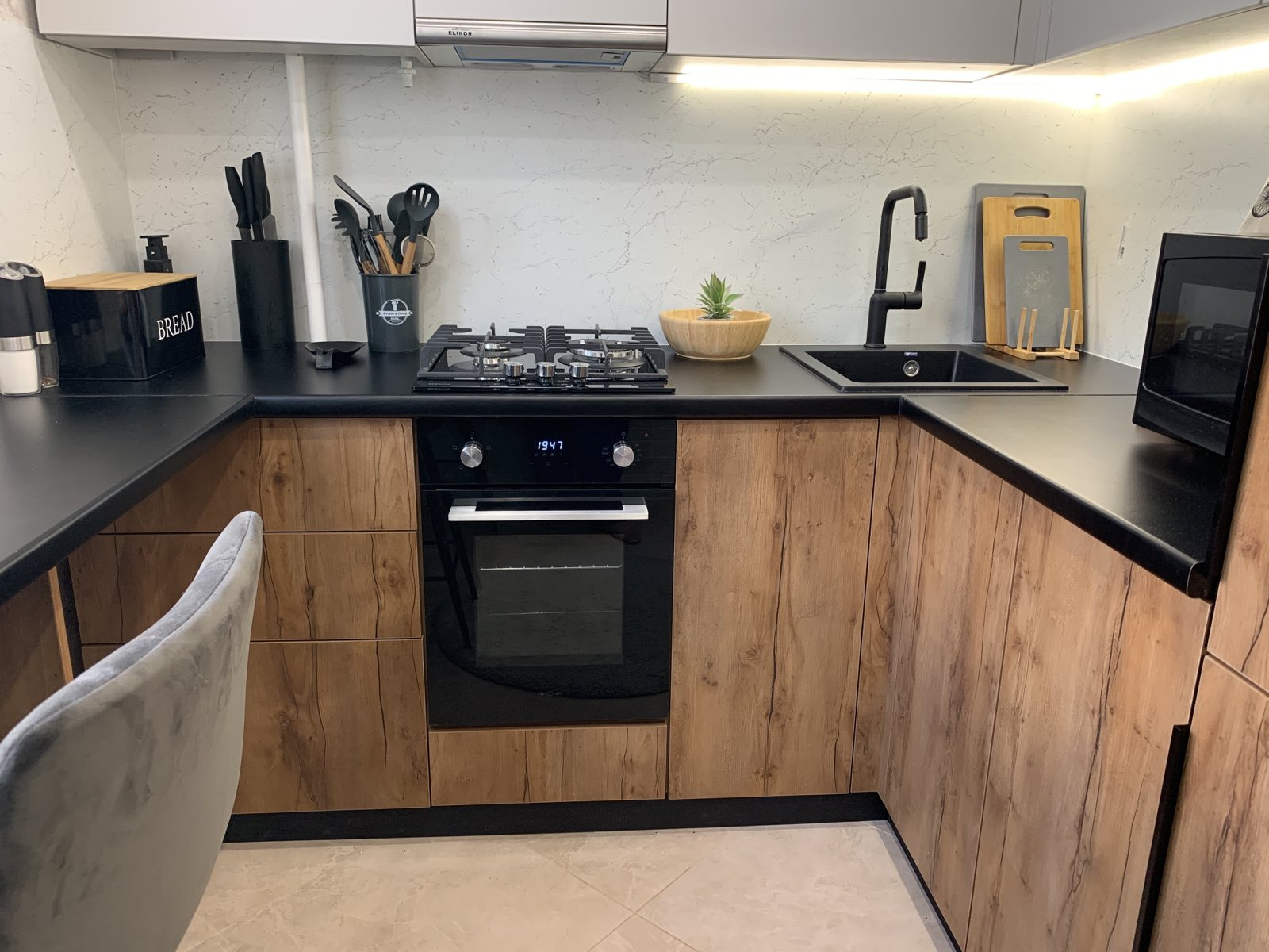 - Остаётся встроенная кухня с встроенной техникой: газовая варочная панель, электрический духовой шкаф, холодильник, стиральная машинка. В спальне остаётся кровать, в большой комнате остаётся шкаф со столом.