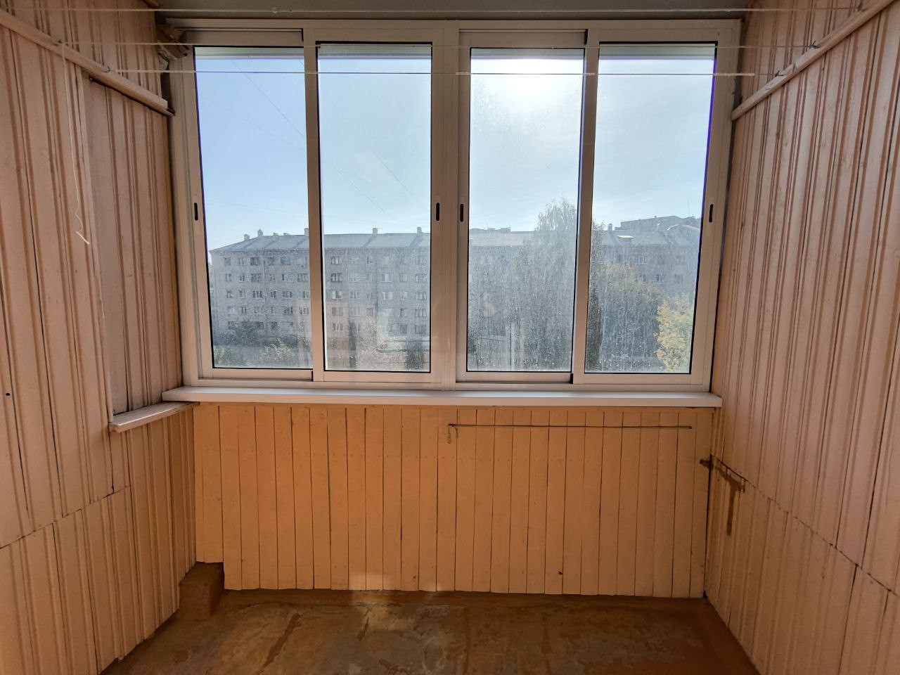 Лоджия застеклена ПВХ. Отделана изнутри деревянными панелями.