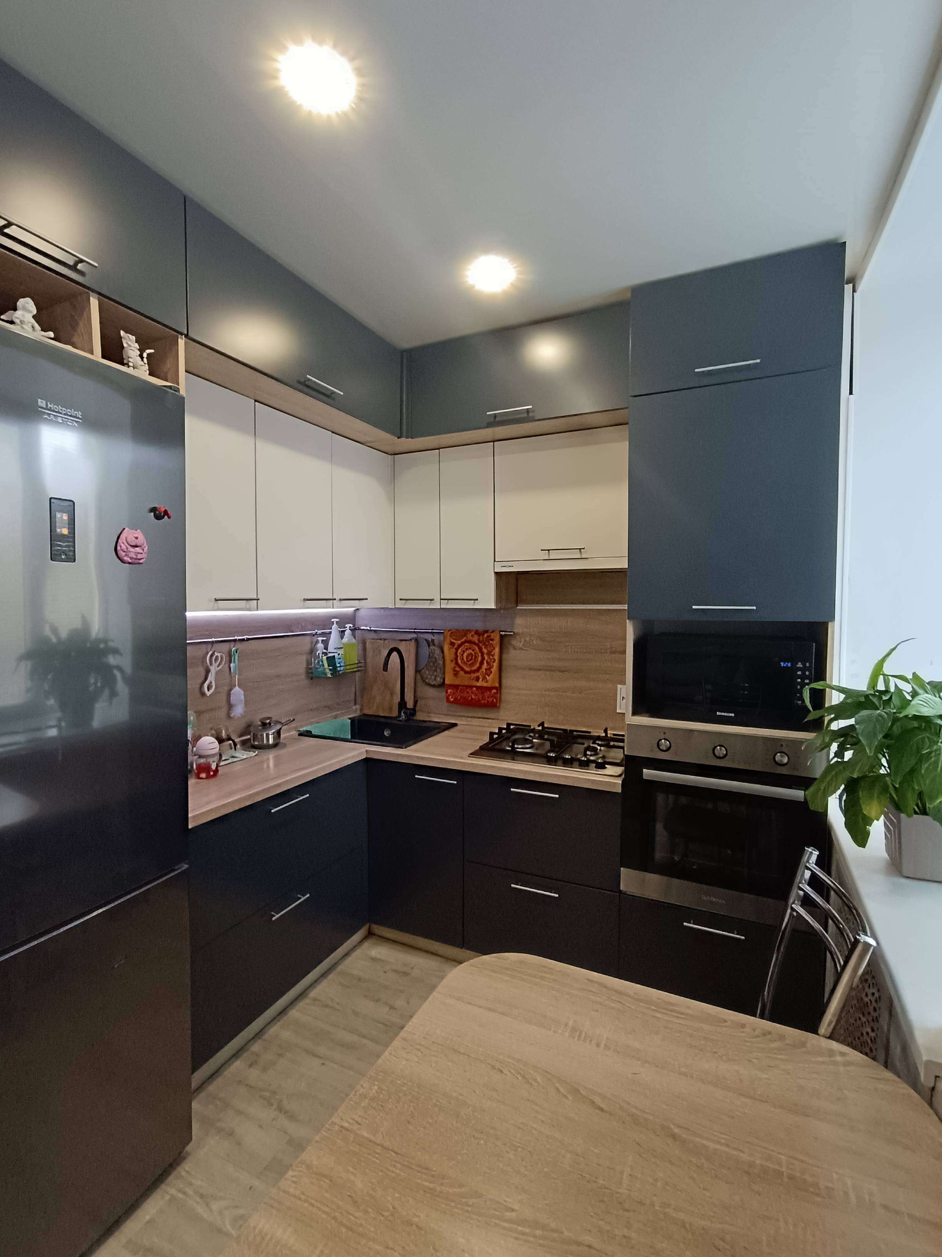 В подарок – НОВЫЙ стильный встроенный кухонный гарнитур. Широкая столешница, оборудована рабочая зона. Функциональные шкафы в потолок. Подсветка по периметру столешницы.