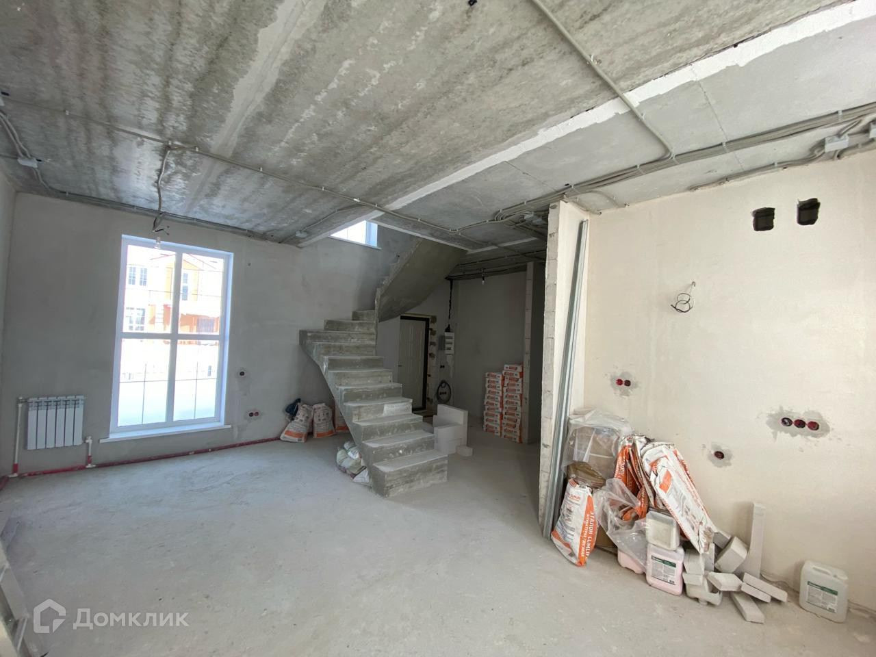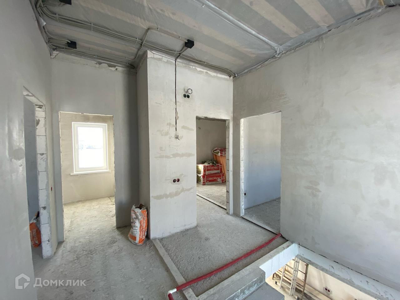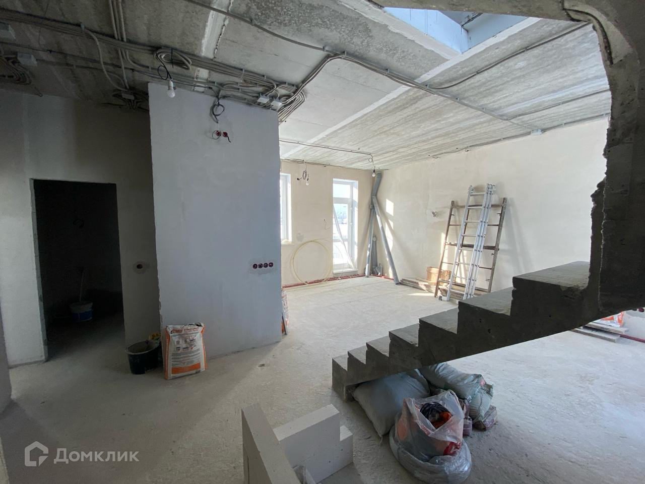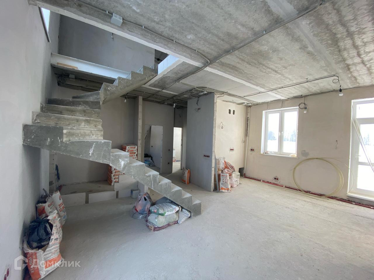 В доме частично выполнена черновая  отделка.  Стены отштукатурены.. Установлена лестница. Сделана разводка электричества. Возведены межкомнатные перегородки.