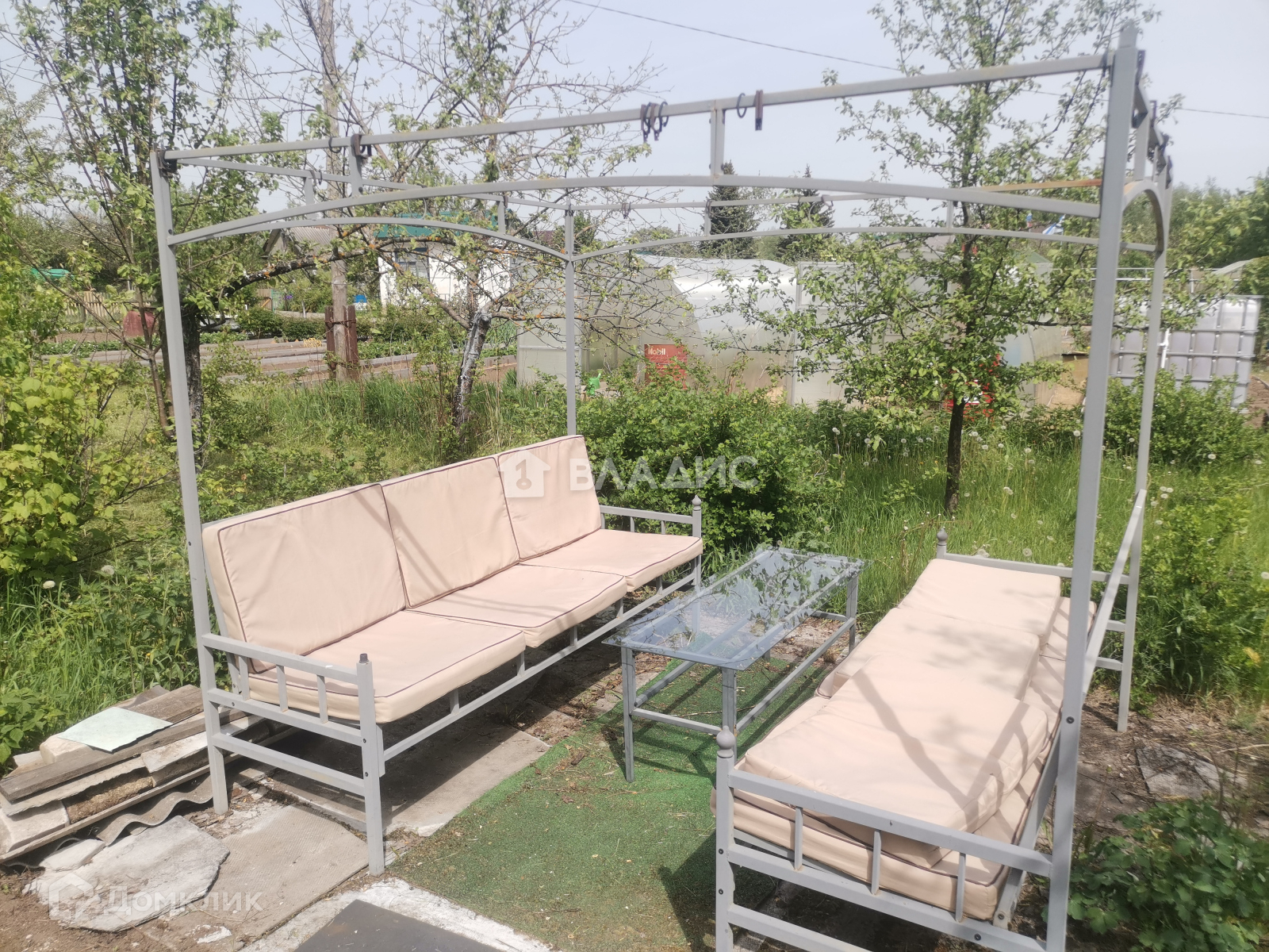 Участок ровный ,прямоугольной формы, имеется садовый домик, беседка.