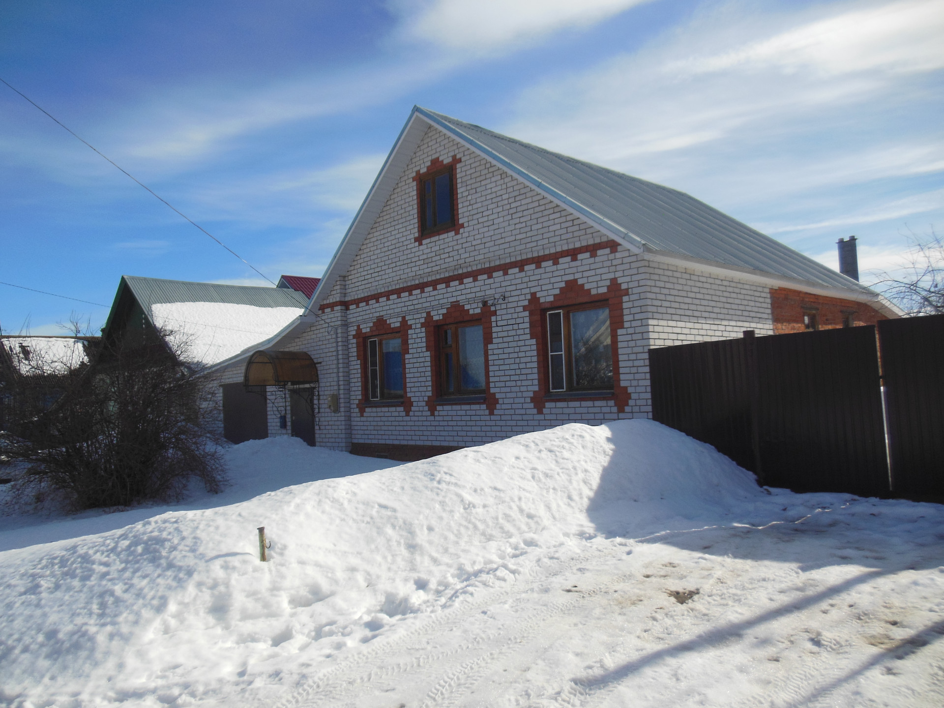 Дом со всему удобствами в хорошем состоянии, где-то нужен косметический ремонт. Основное строение с 1961 г из бревен обложено кирпичом (в хорошем состоянии), пристрои кирпичные были сделаны в 1998 г и 2006 г .  Три комнаты: зал 29,9 кв.м, спальни 10,4 и 7,8 кв.м, кухня 17,6 кв.м.  Двор крытый с гаражом и погребом. Баня новая.  Один собственник (свыше 5 лет), документы в порядке, межевание участка выполнено. Торг.