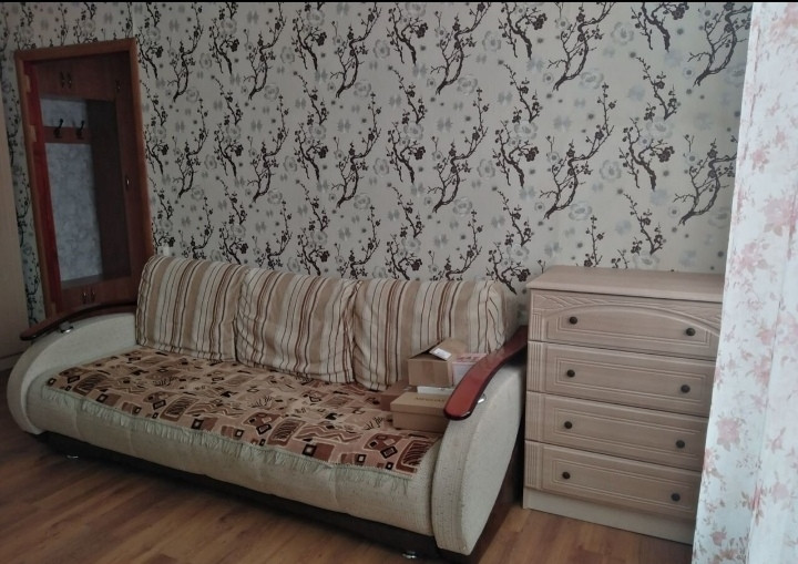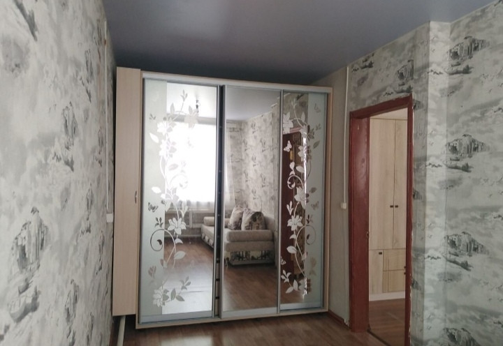 в комнате - диван, встроенный шкаф купе с зеркалами,