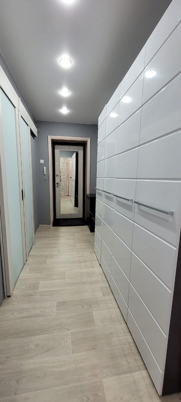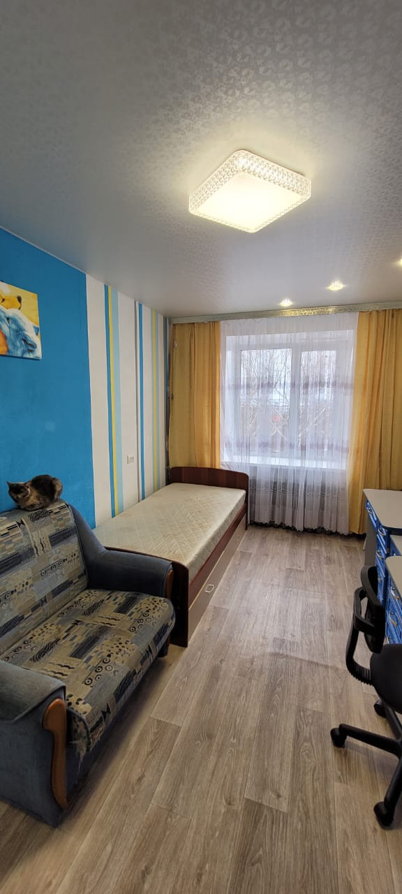 Oкна- пластикoвыe. Потолки -натяжные. Ha полу линолeум.