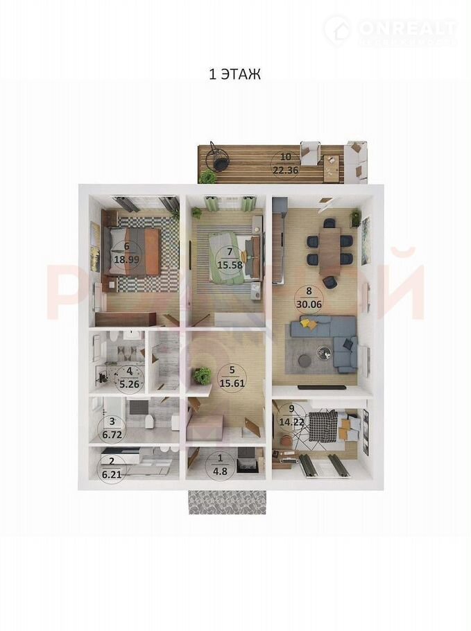Вас ждут: просторная прихожая, котельная, 2 санузла, 3 спальни, шикарная кухня - гостиная с панорамным остеклением, открывающим потрясающие виды, и выход на просторную террасу – идеальное место для летних вечеров.