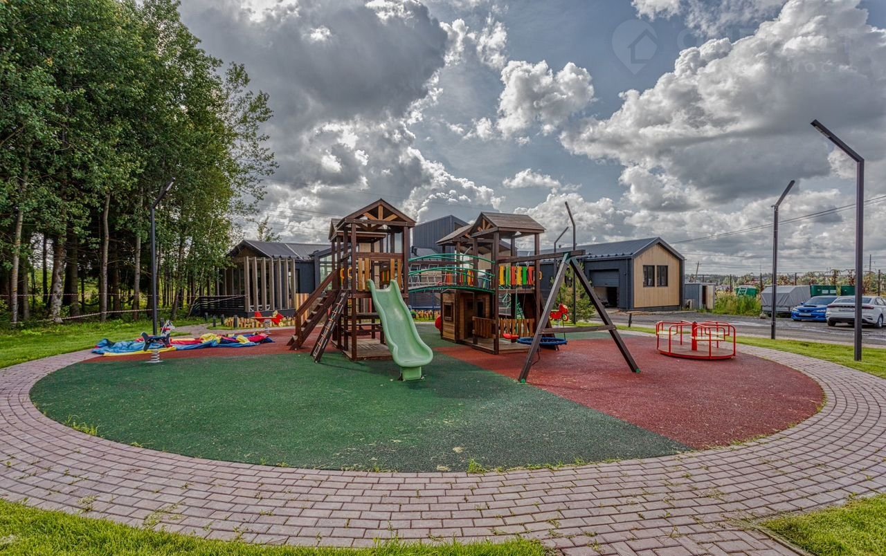 Детская площадка с батутами, качелями и песочницей, где дети пропадают часами.