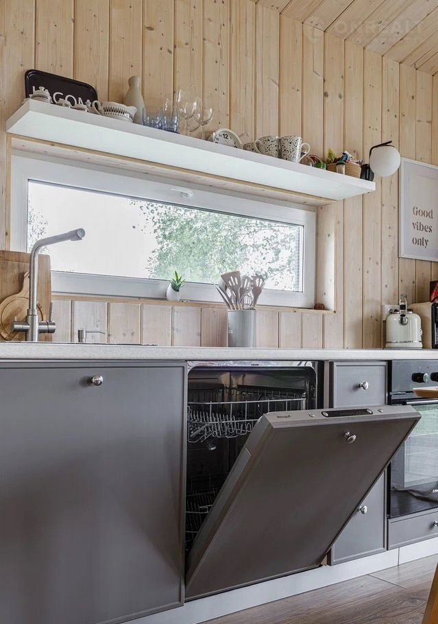 полностью оборудованная кухня со всей необходимой бытовой техникой, посудой и столовыми принадлежностями (от кастрюль и сковородок до вилок, ложек, бокалов и стопок). Есть посудомойка!