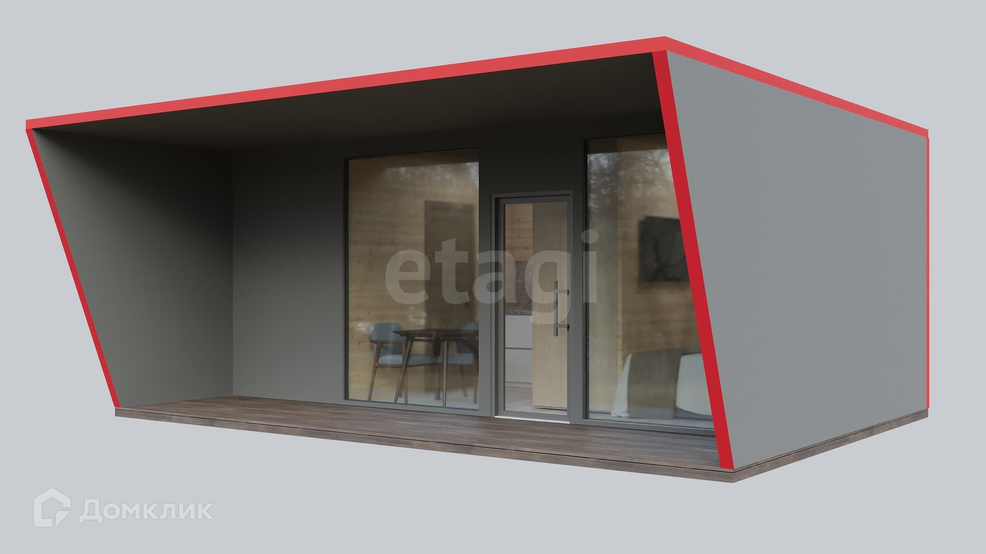 Облицовка выполнена из пластика, армированного стекловолокном. Модуль оснащен панорамным остеклением, санузлом, сантехнической разводкой, вентиляцией и крытой террасой. Преимущества этого модуля-дома очевидны: отличная теплофизика, шумоизоляция, жесткая конструкция, исключение развития патогенной флоры и животных, удобство в уходе и безопасность. Материалы, из которых изготовлен модуль, сертифицированы и не поддерживают горение.