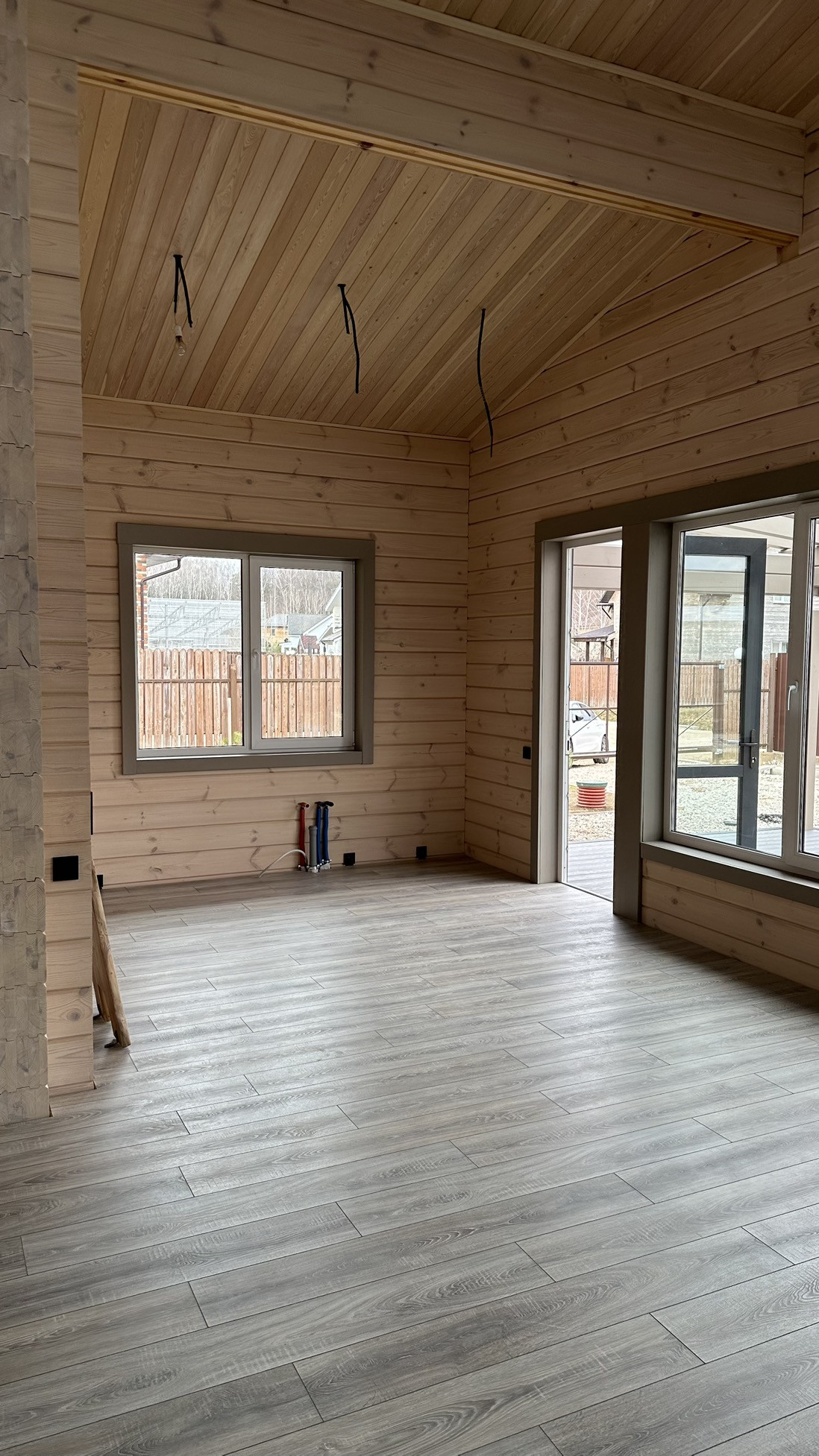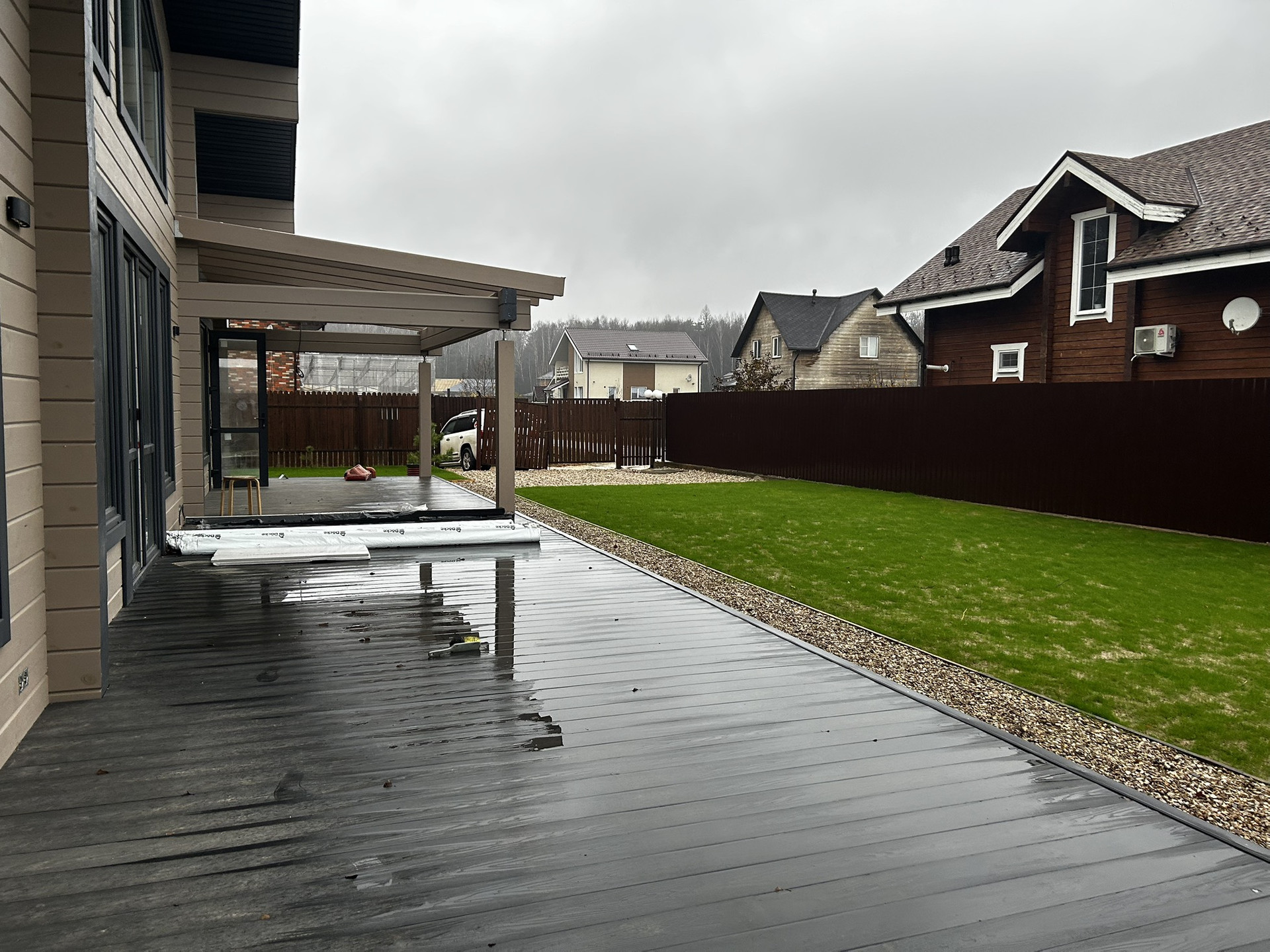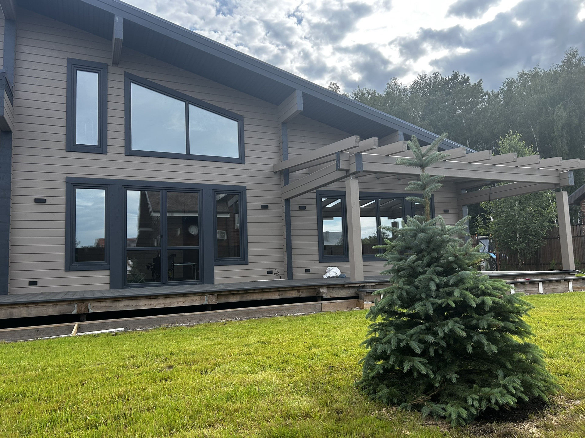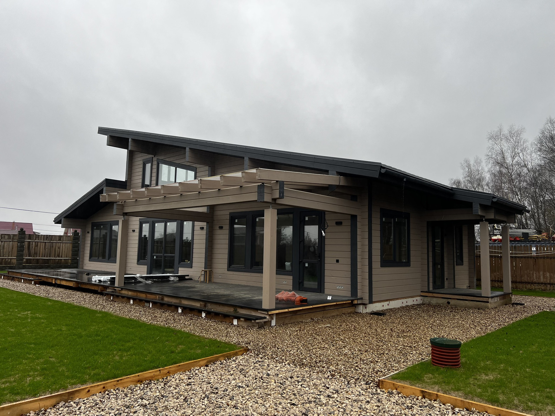 остались косметические доработки, в процессе…(заливка бетоном парковки, установка черепицы на веранде вместо проектного покрытия,зашив веранды,подвод электрики к бане,воротам и калитки)