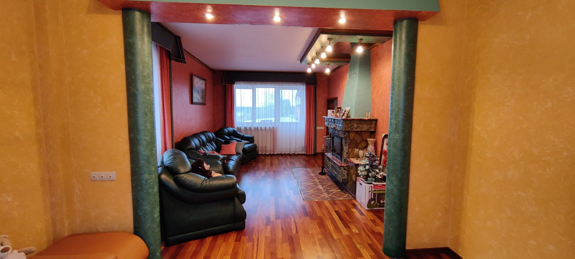 Первый этаж: прихожая, большая кухня-столовая (25,6 кв.м), сан.узел совмещенный (6,1кв.м), комната 14,9 кв.м, гардеробная, гостиная с камином (30,8 кв.м) и балконом;