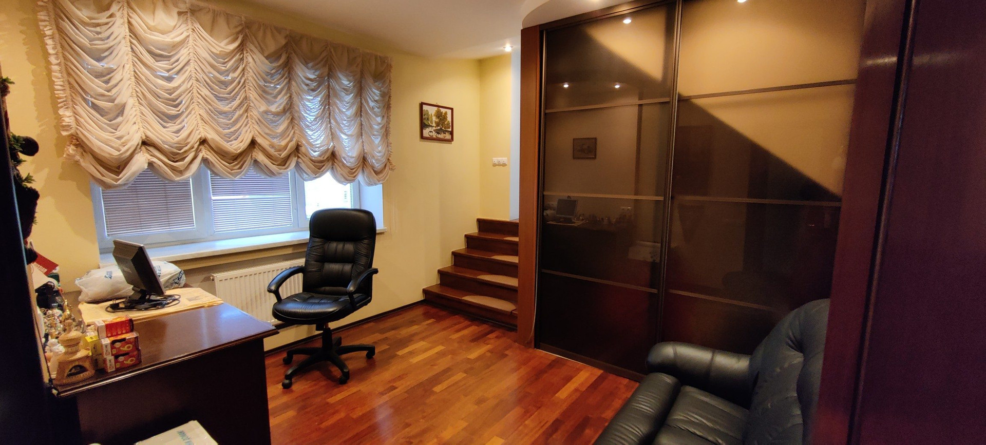 Второй этаж: комната (26кв.м), сан.узел совмещенный (5,6 кв.м), кабинет (14,8 кв.м) с выходом в зимний сад (3,5 кв.м), комната (17,4 кв.м) с выходом на большой балкон (6,3 кв.м), комната (24 кв.м) с выходом на свой отдельный балкон;