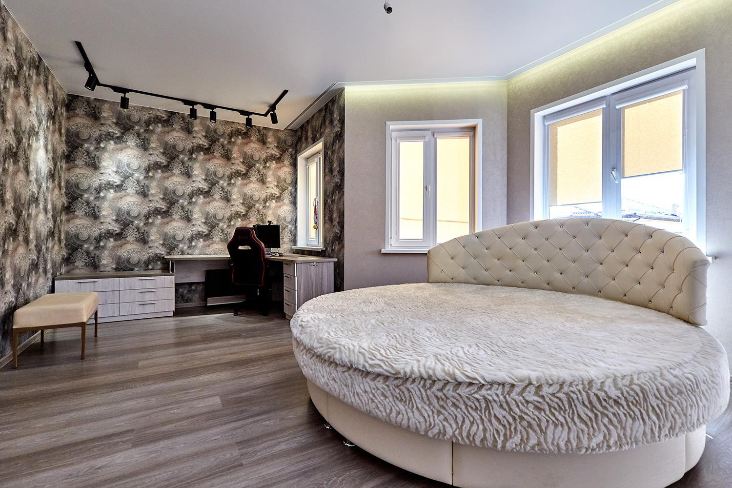 Два этажа. На первом этаже спальня и большая кухня-гостиная с выходом на террасу и задний двор; на втором - три спальни, свой санузел на каждом этаже.
