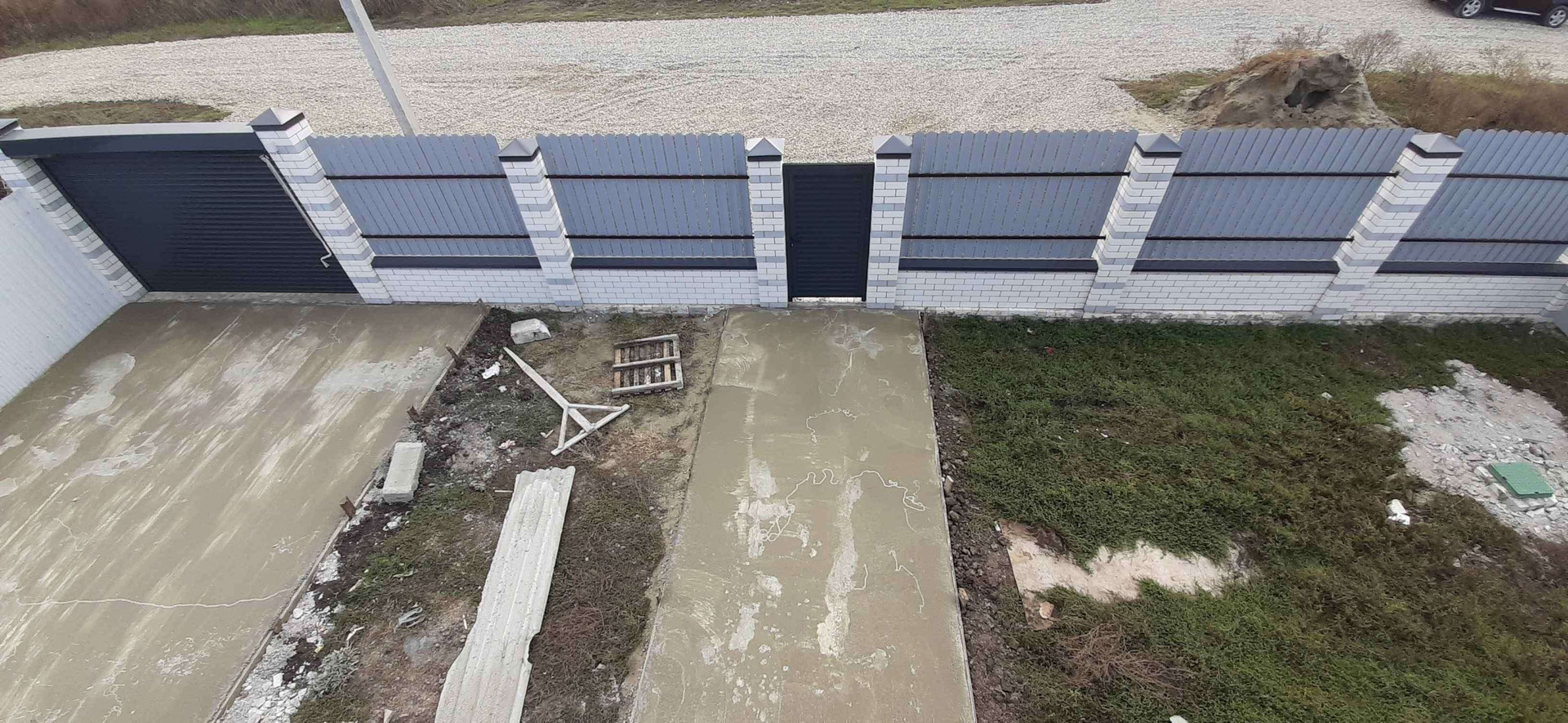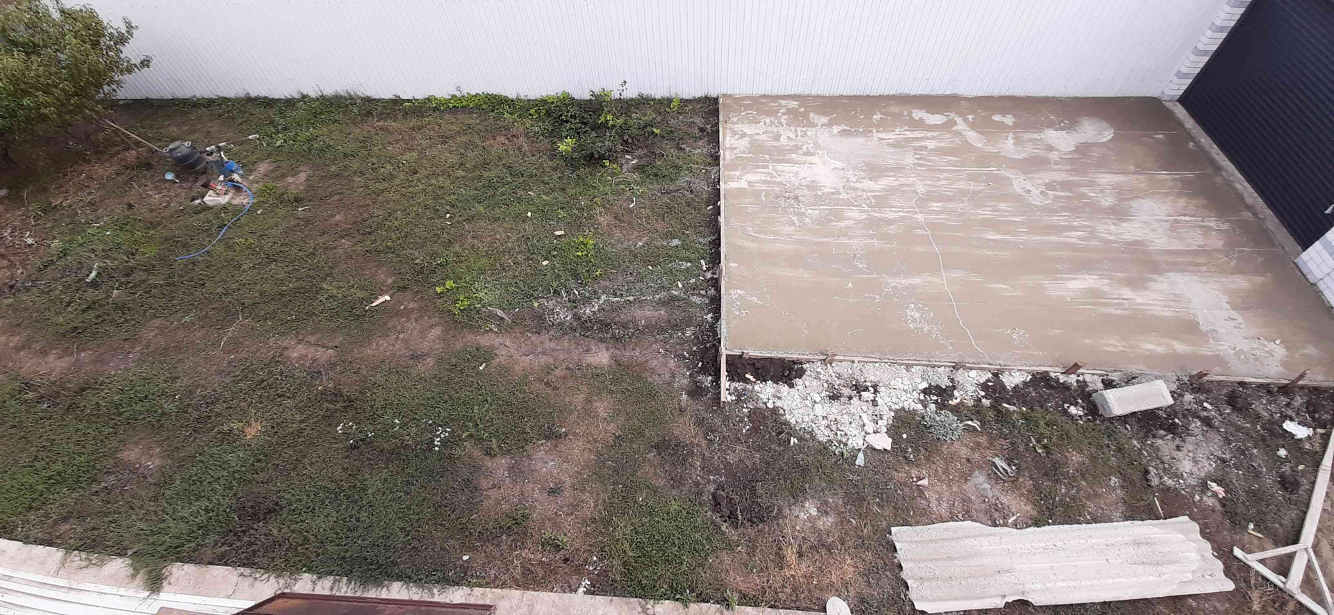 вокруг всего дома сделана отмостка, терраса на заднем дворе