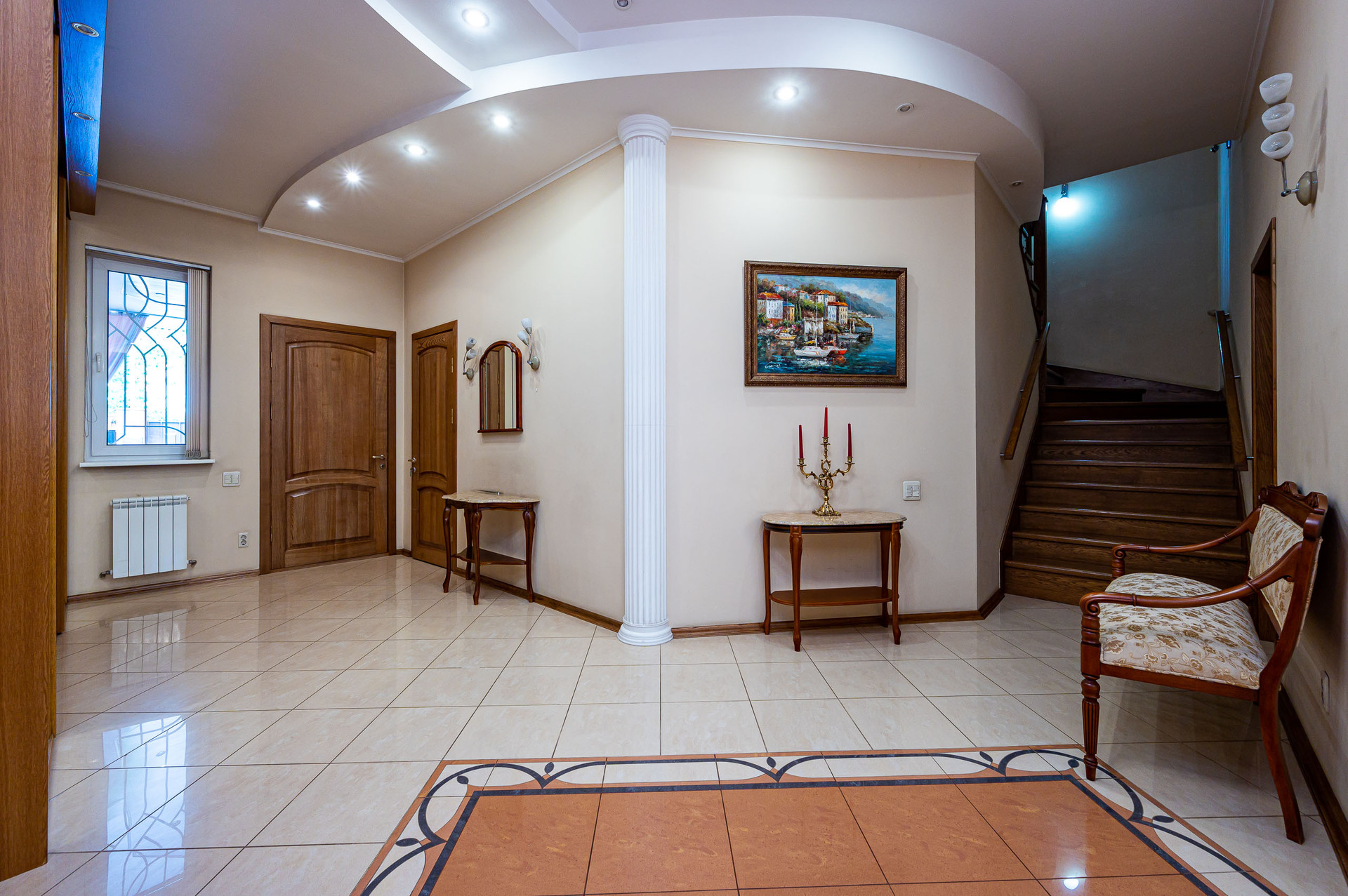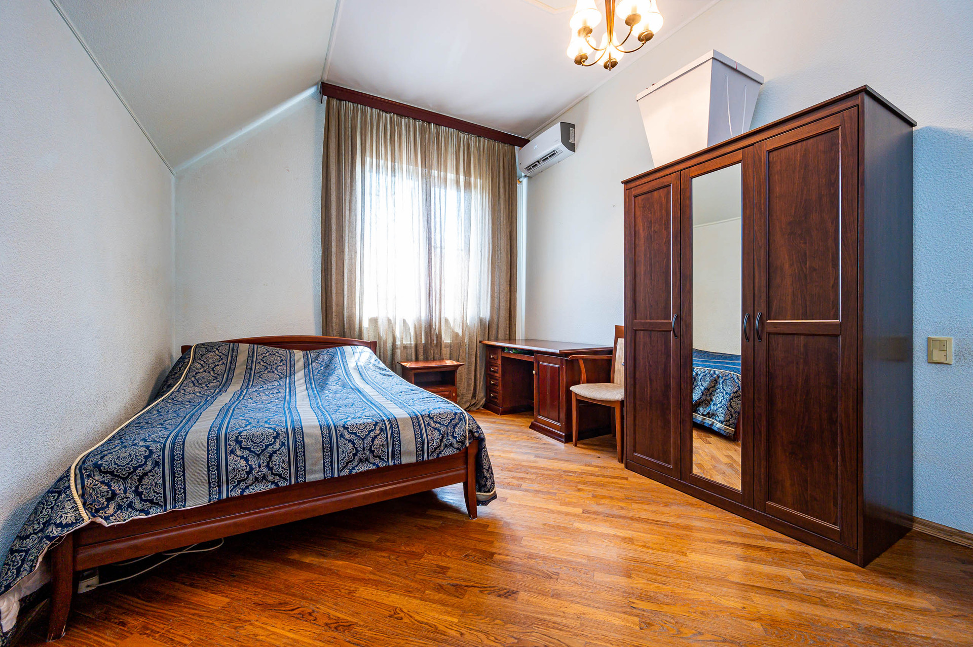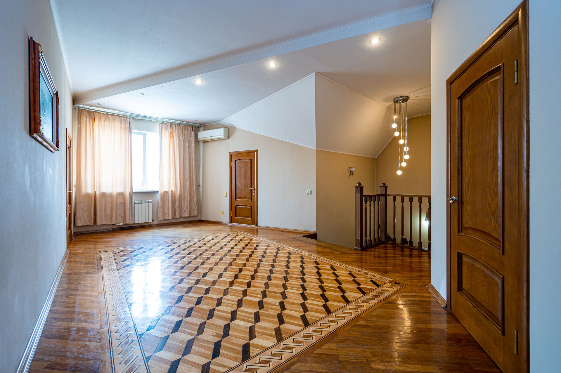2 этаж - холл, комната 26 м2, гардеробная 11 м2, комната 17 м2 с санузлом с душевой кабиной, мастер-спальня 24 м2 с ванной. С холла второго этажа выход на террасу площадью 34 м2. Напольное покрытие второго этажа паркет . В каждой комнате дома и в холлах установлены сплит системы. Электричество 40 квт. Так же есть летняя кухня и санузел.