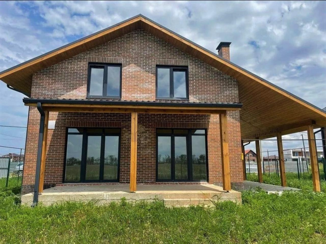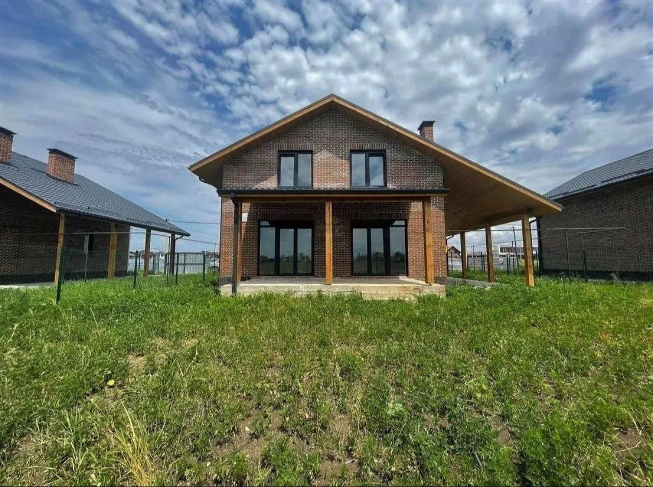 вокруг всего дома сделана отмостка, терраса на заднем дворе