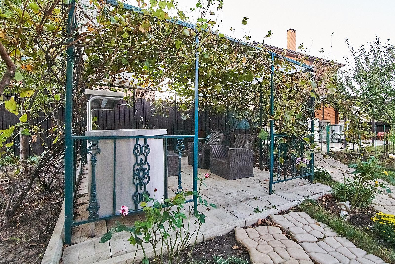 Двор ухоженный, положена плитка. Великолепное озеленение, разнообразие деревьев, кустарников и цветов! Есть беседка и зона отдыха.