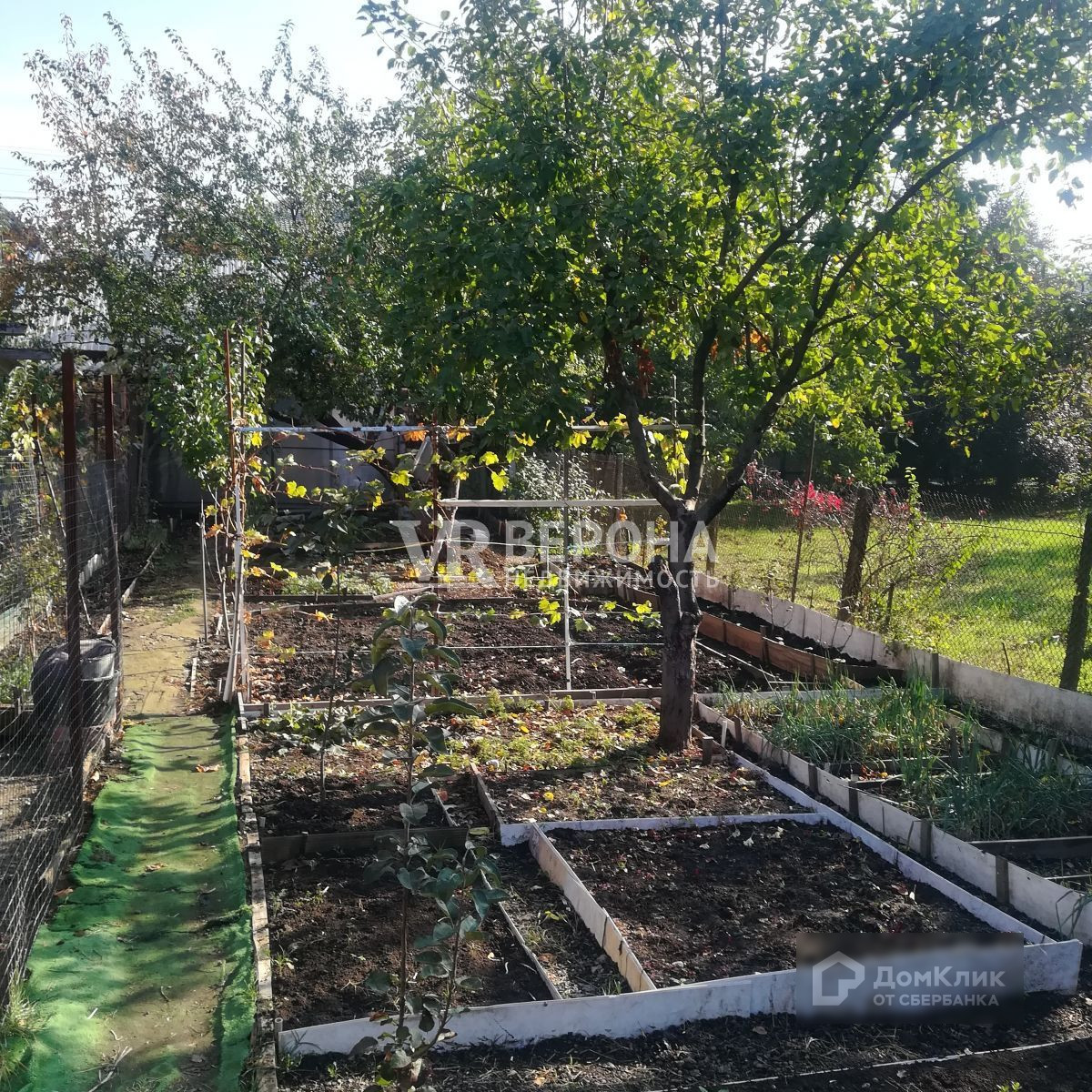 Ухоженный двор. Сад с плодовыми деревьями, виноград, Под навесом с откатными воротами место для автомобиля. Участок выходит на две параллельные улицы.