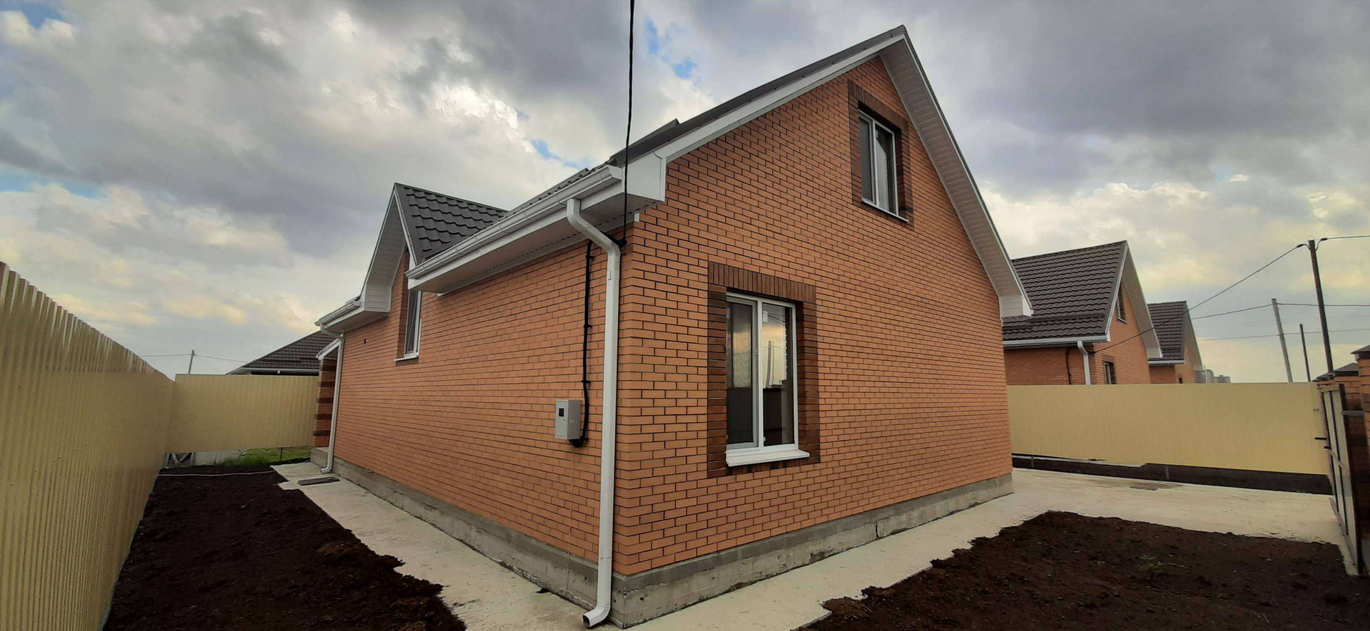 вокруг всего дома сделана отмостка, терраса на заднем дворе