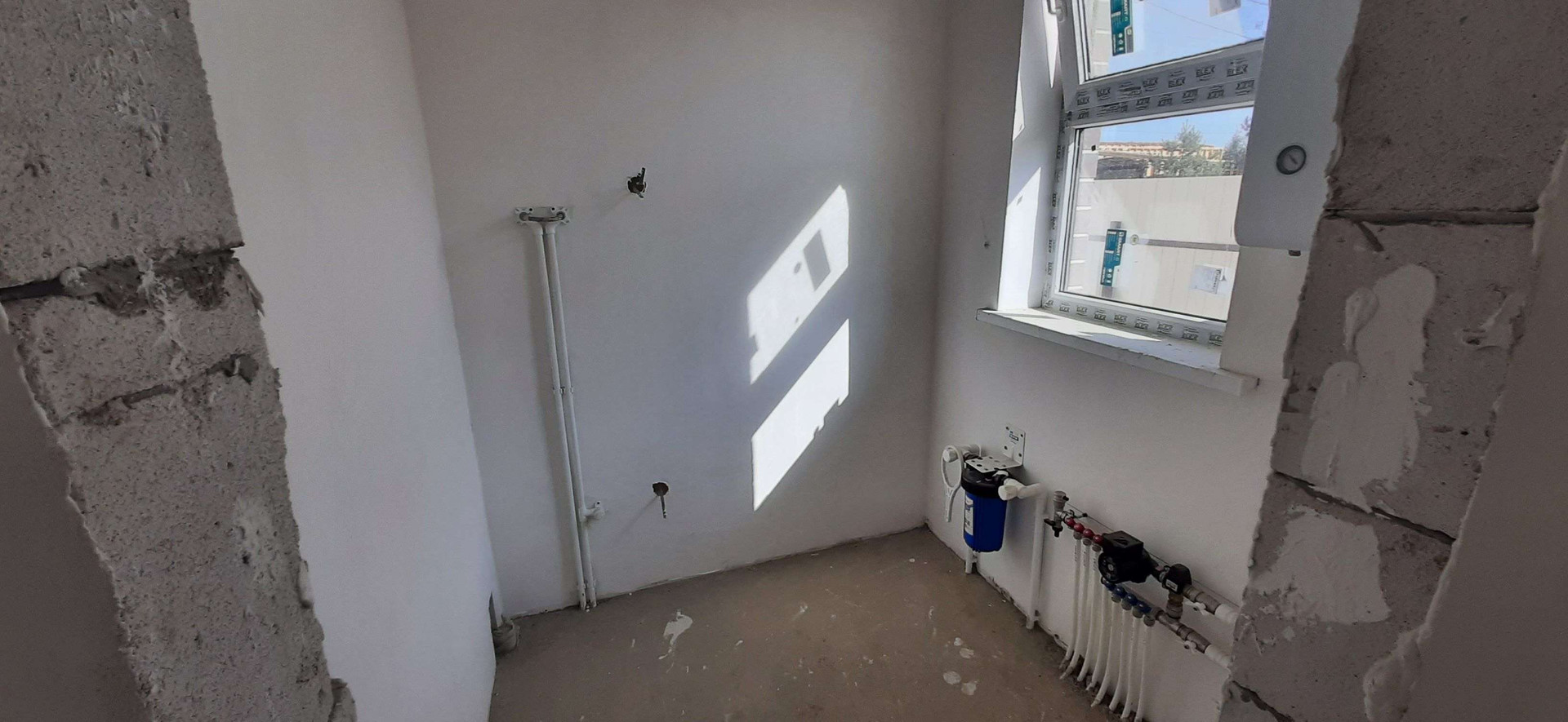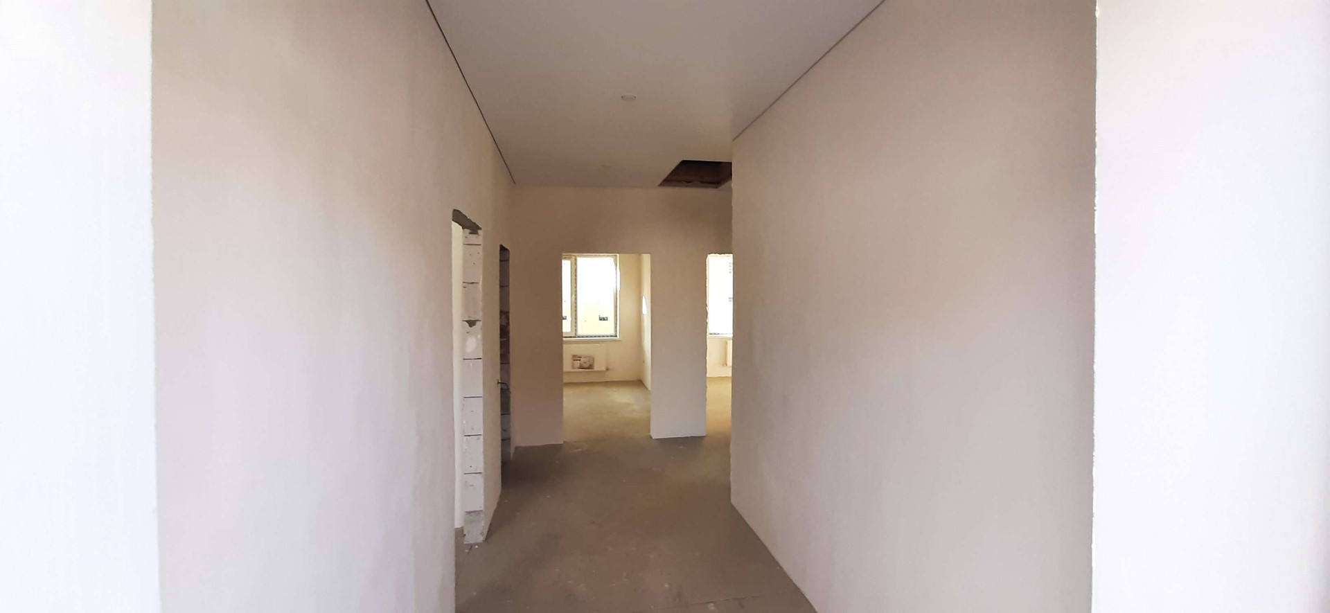 сделана качественная предчистовая отделка, гладкие белые стены подходят для покраски или поклейки обоев, идеально ровная механизированная стяжка пола