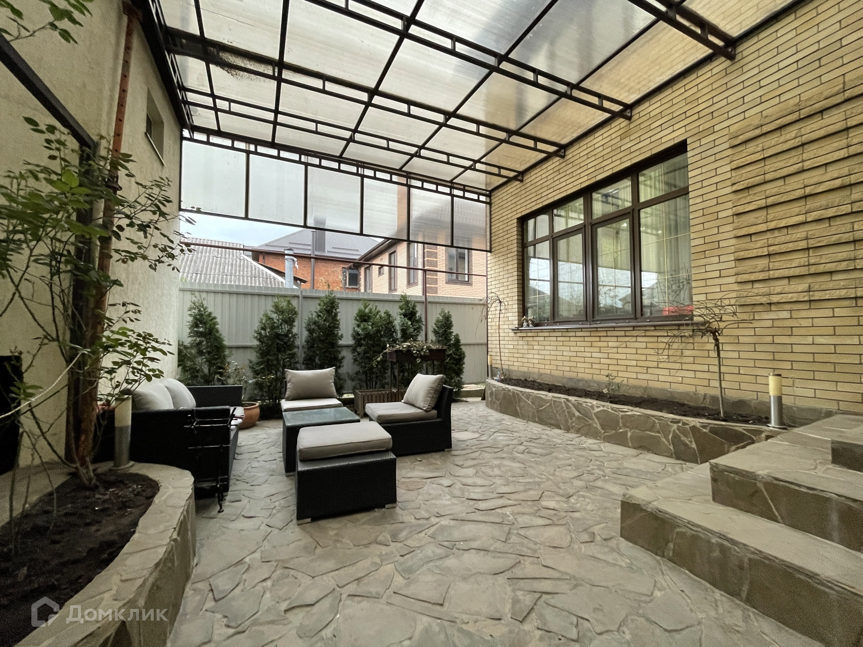 Высокий фундамент, крытый внутренний двор с организованной зоной отдыха. Во дворе место для 2-х автомобилей.