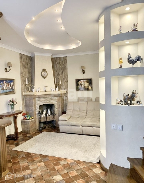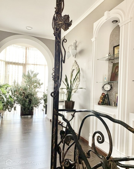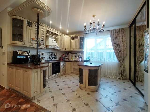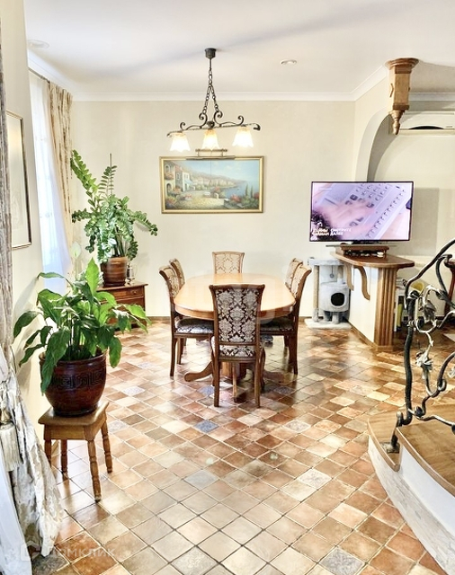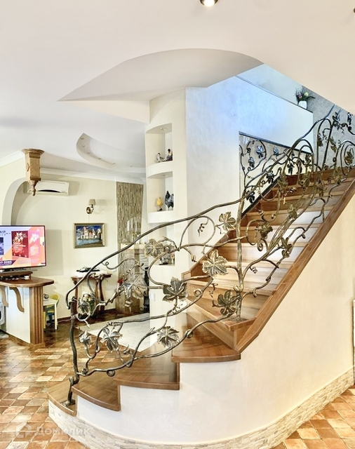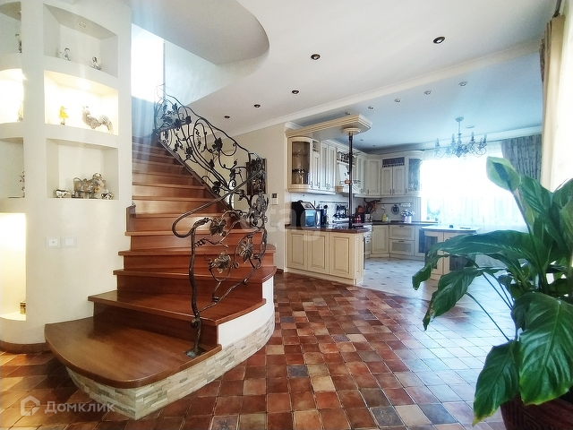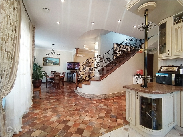 На первом этаже находится просторная кухня-гостиная, каминный зал, санузел, а так же, визитная карточка дома - шикарная винтовая лестница с кованными перилами ручной работы, которая придает дому шарма, изящества и благородства. На кухне встроенная техника: посудомоечная машина, индукционная плита, духовой шкаф и вытяжка, все это остается при продаже дома.