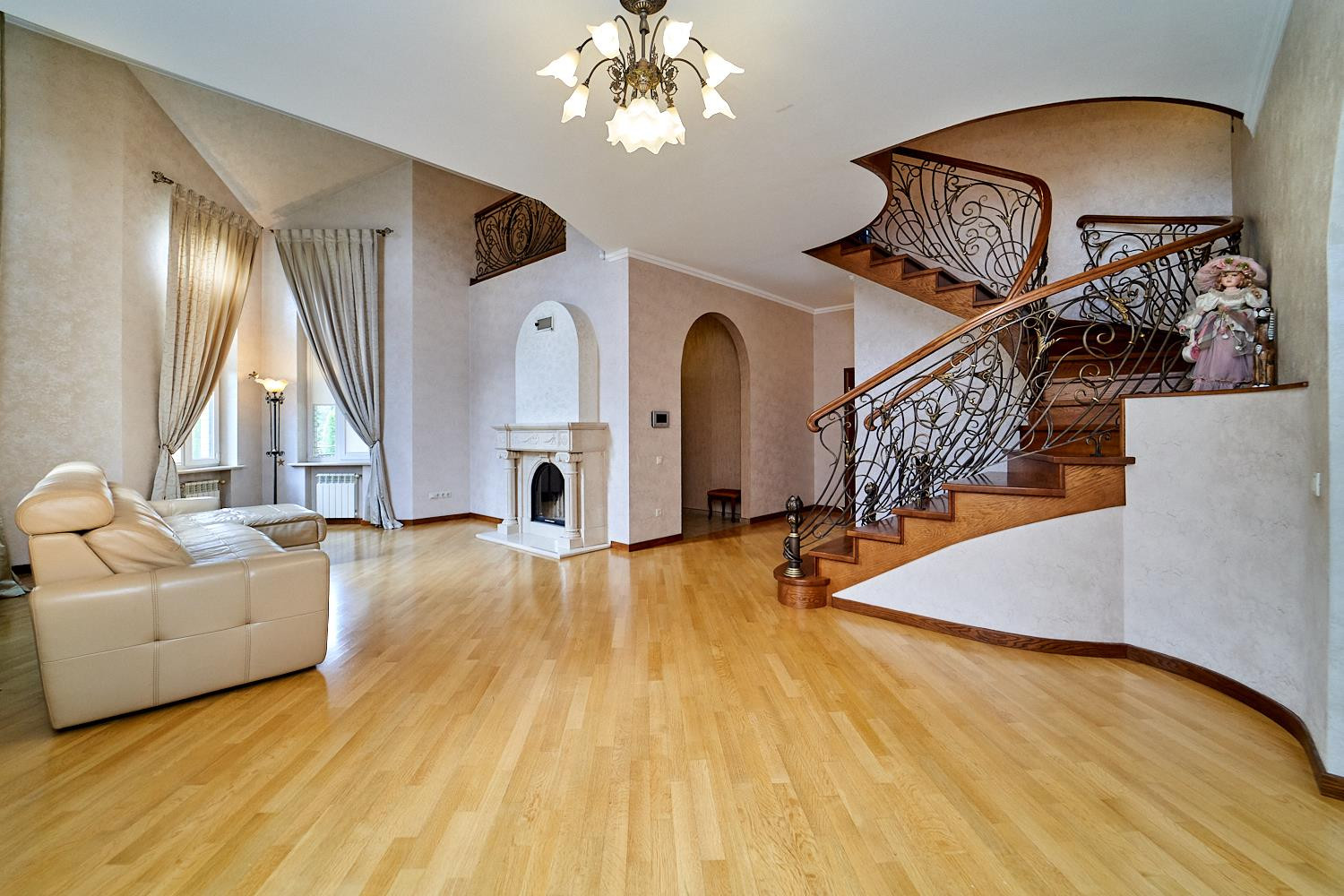 В доме сделана качественная и дорогая отделка. Винтовая лестница из настоящего дерева ясеня. Отделка в классическом стиле. Дом построен по индивидуальному проекту с удобной планировкой.