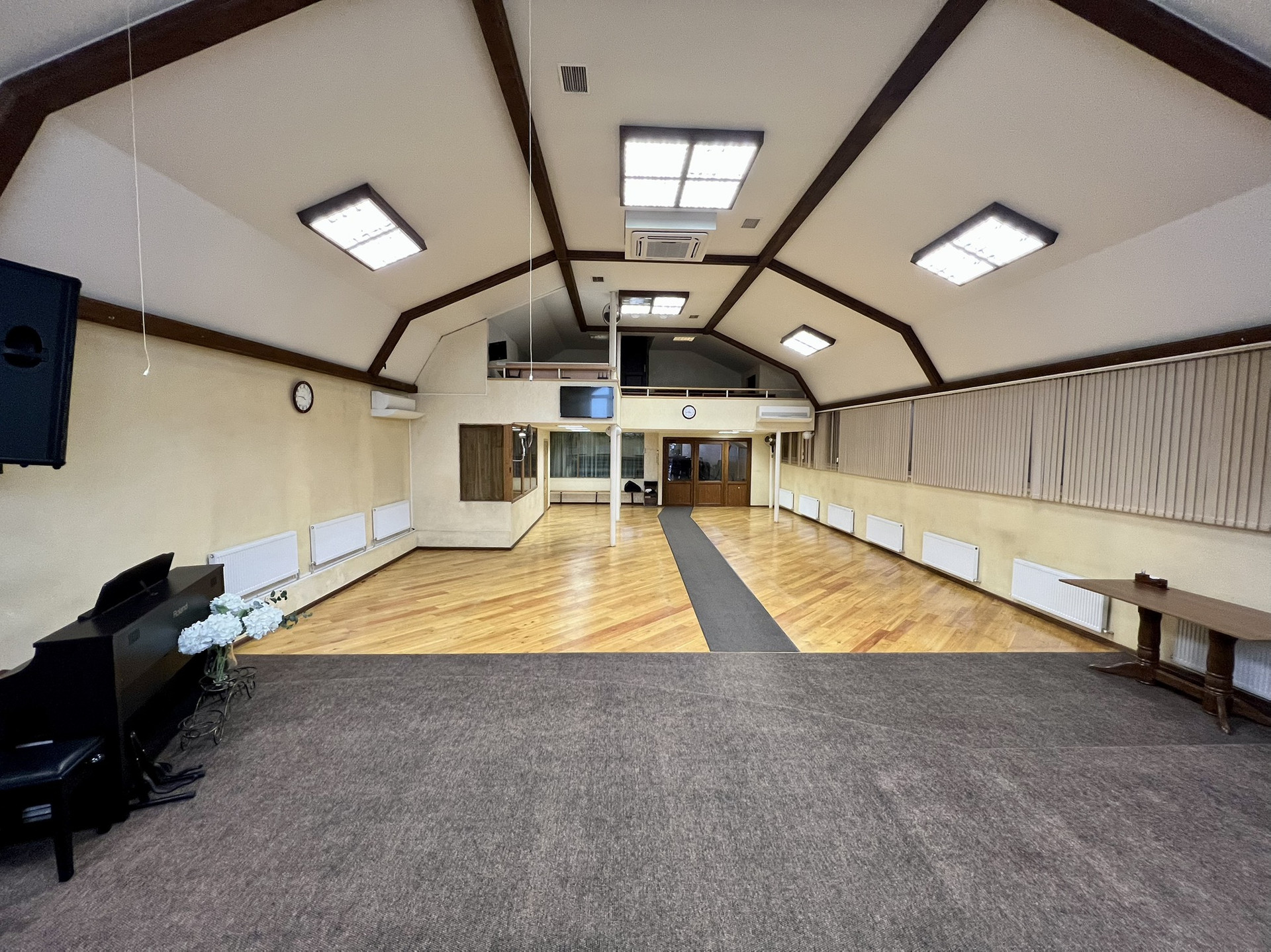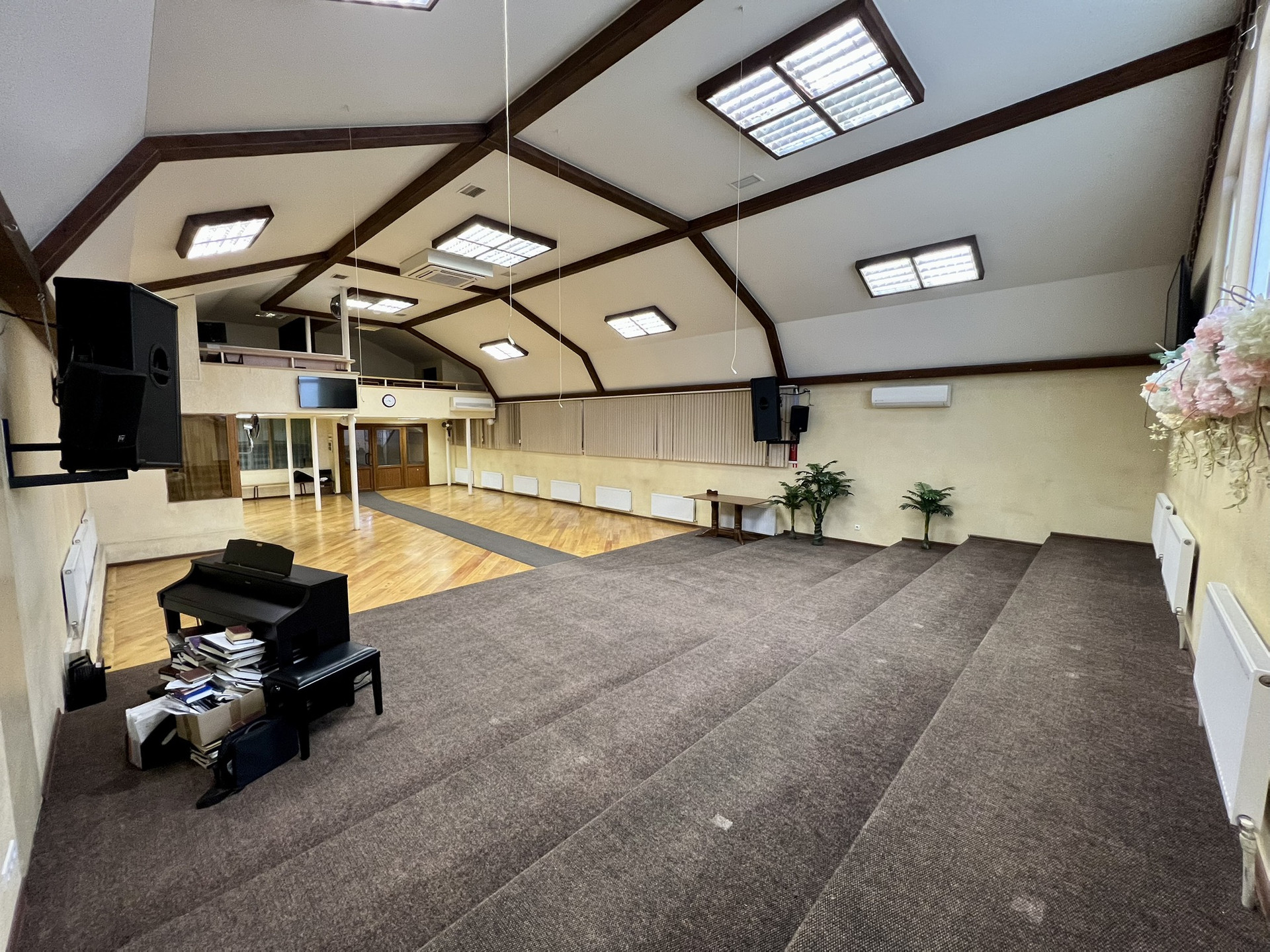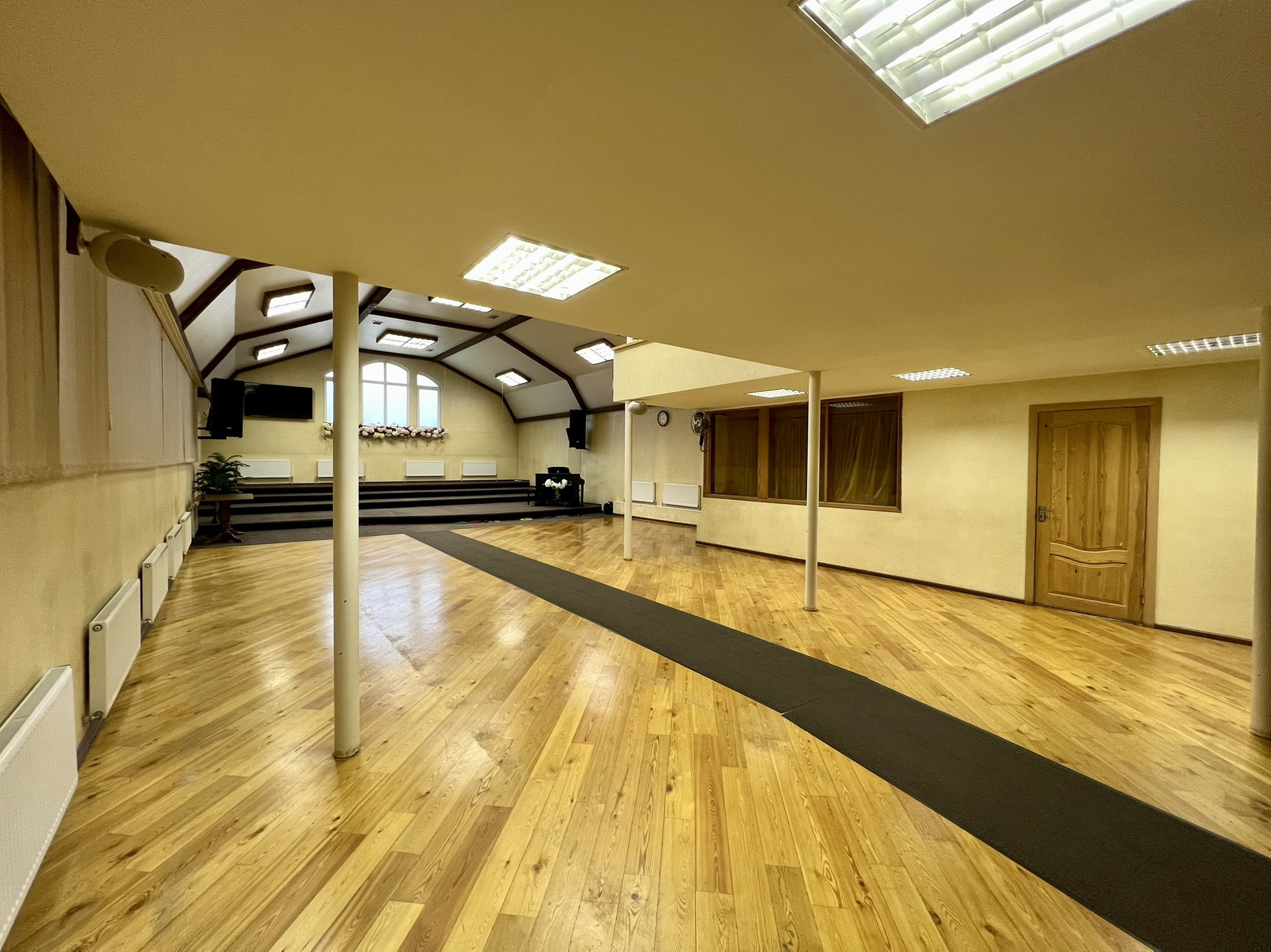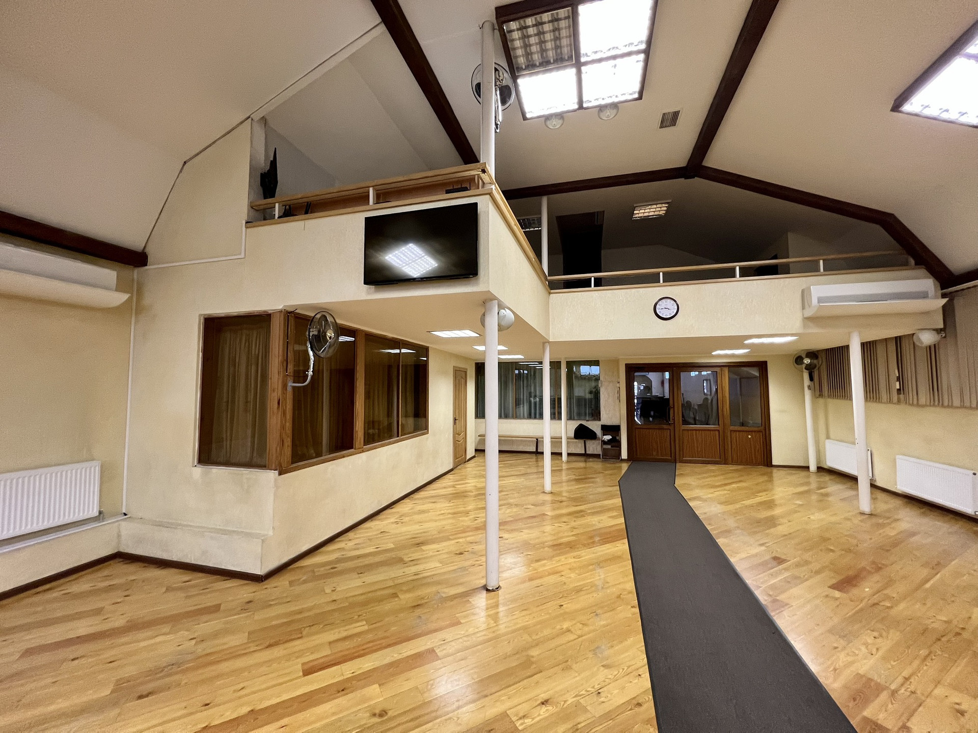 На первом этаже большой зал с 2-мя комнатами, операторской, столовой, детской, с 2-мя сан. узлами  и большим холлом-гардеробной.