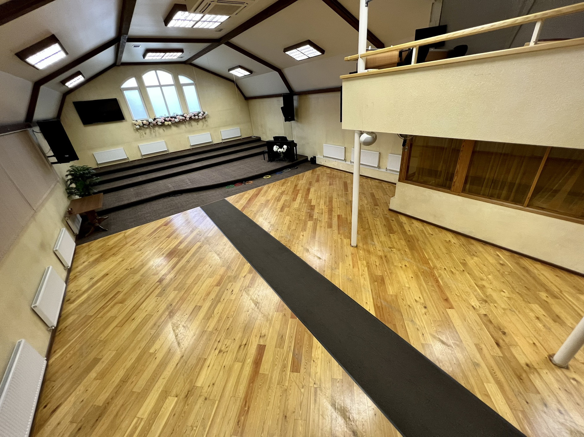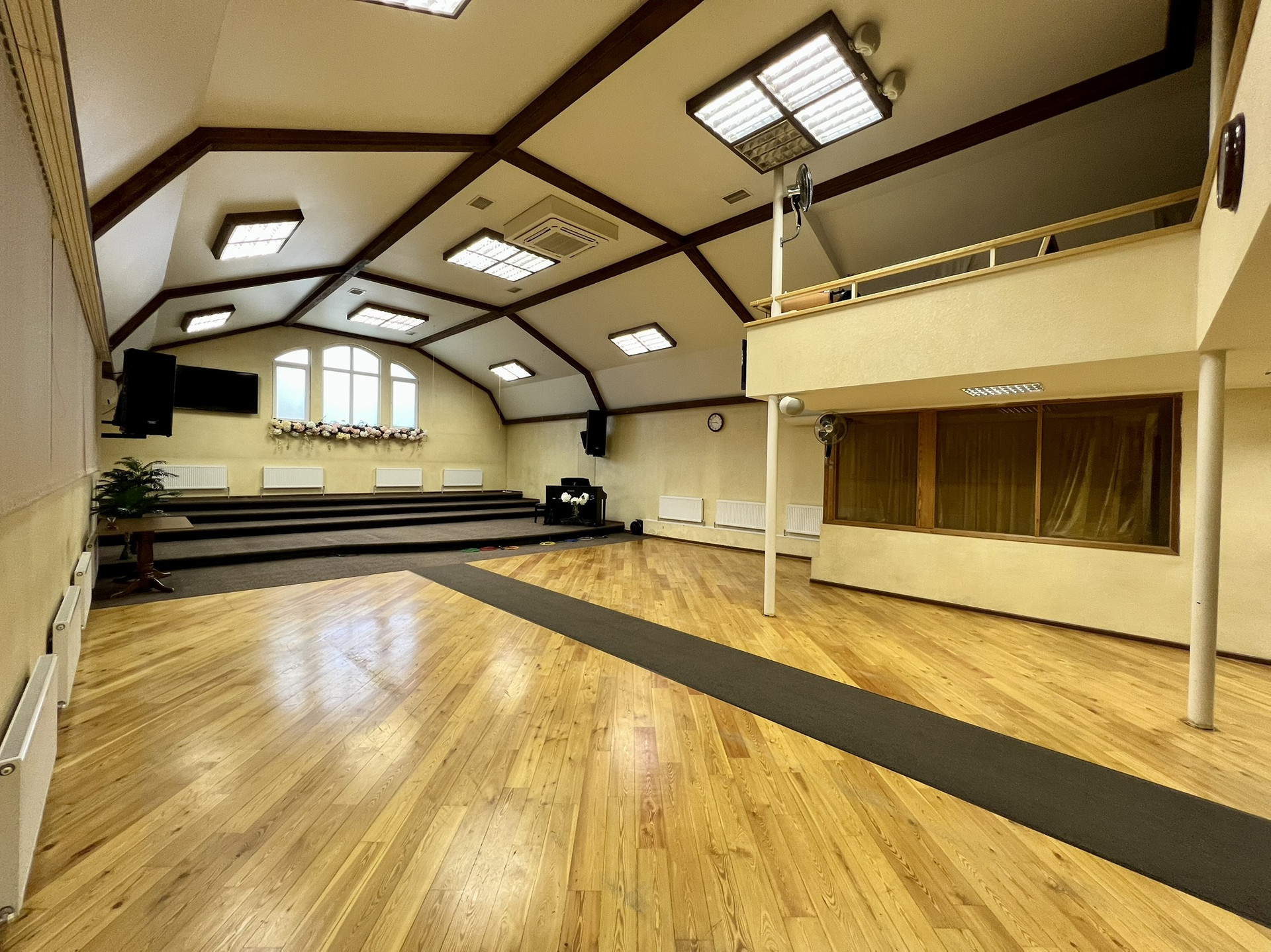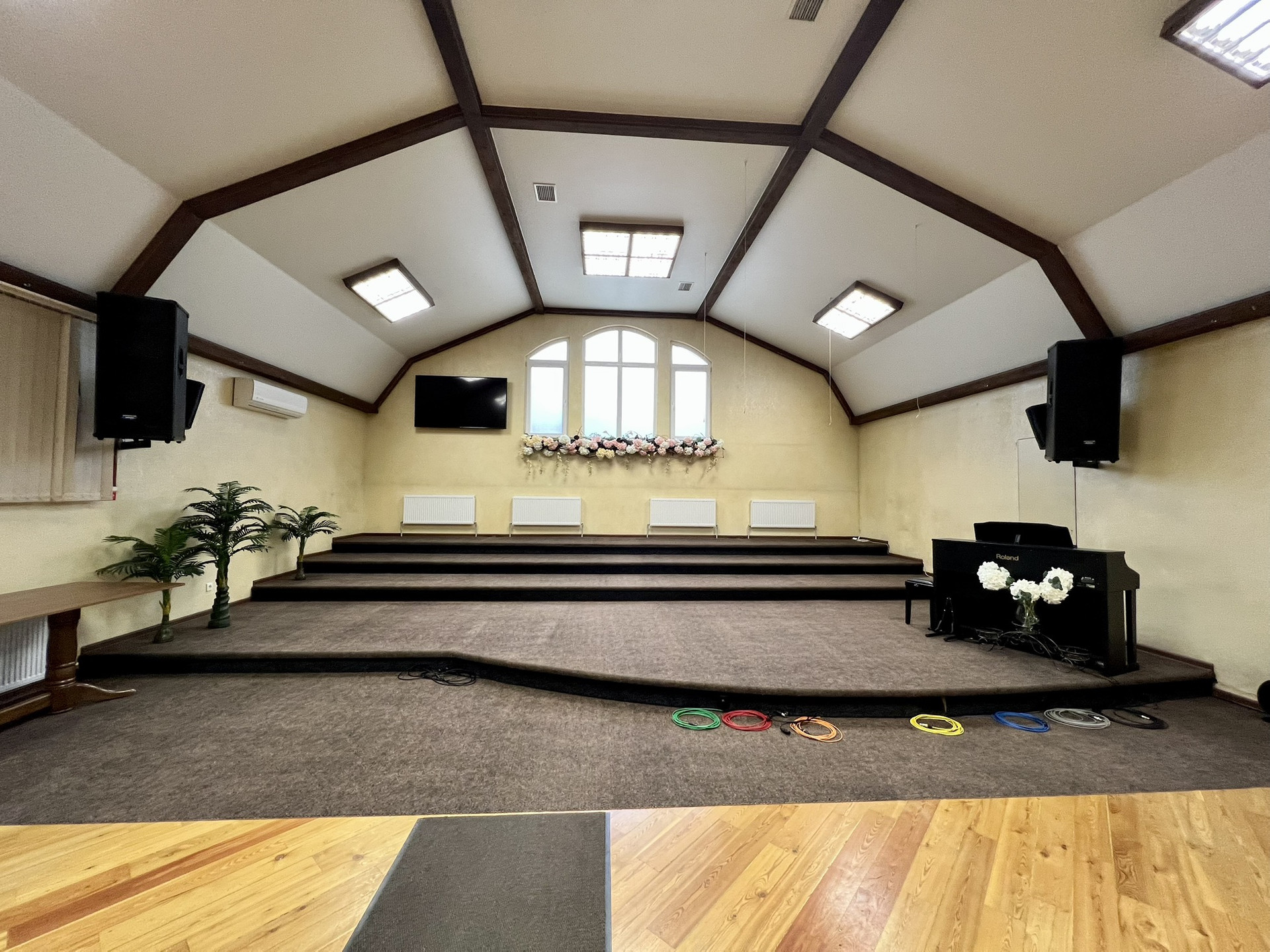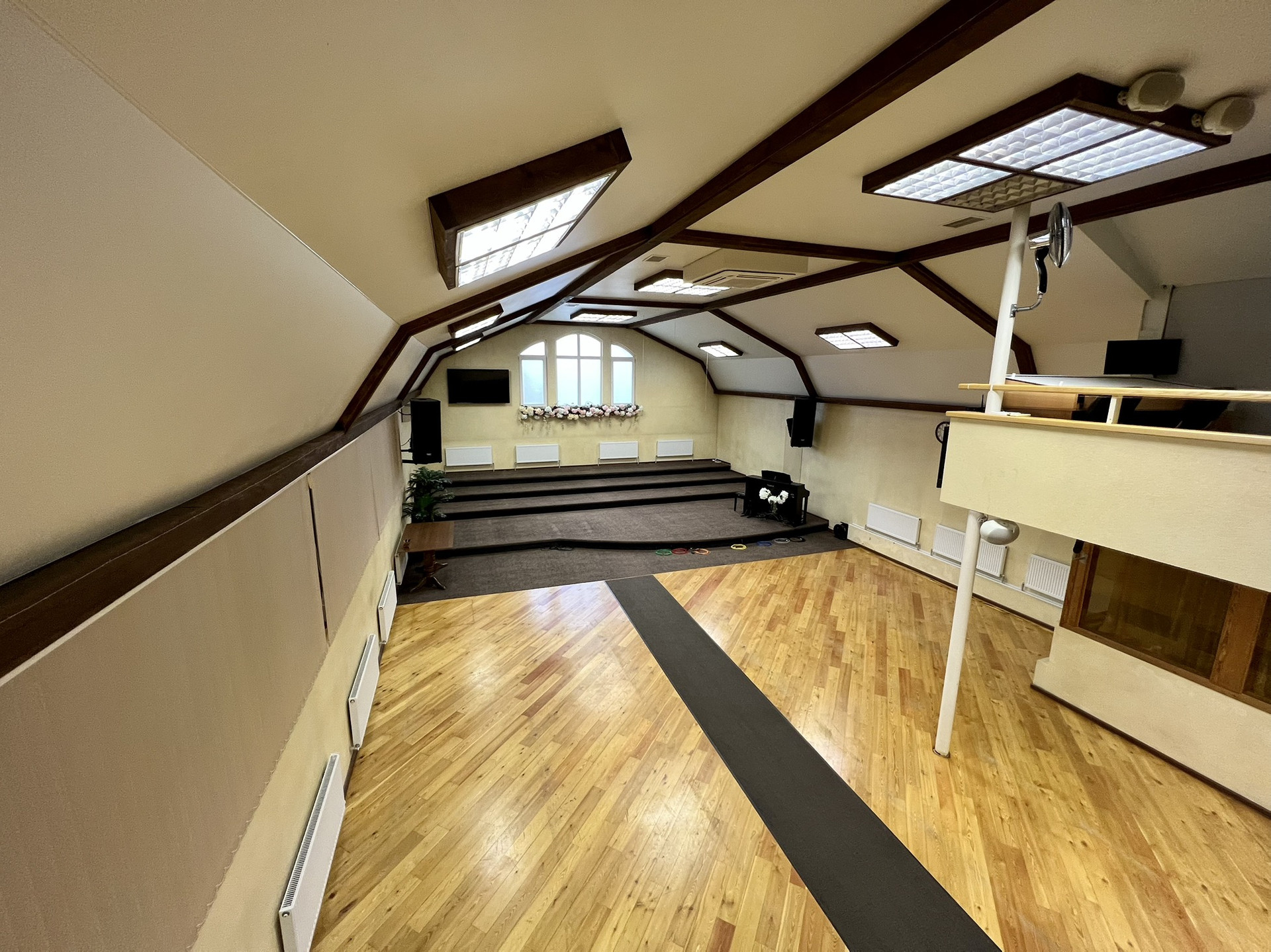 На первом этаже большой зал с 2-мя комнатами, операторской, столовой, детской, с 2-мя сан. узлами  и большим холлом-гардеробной.