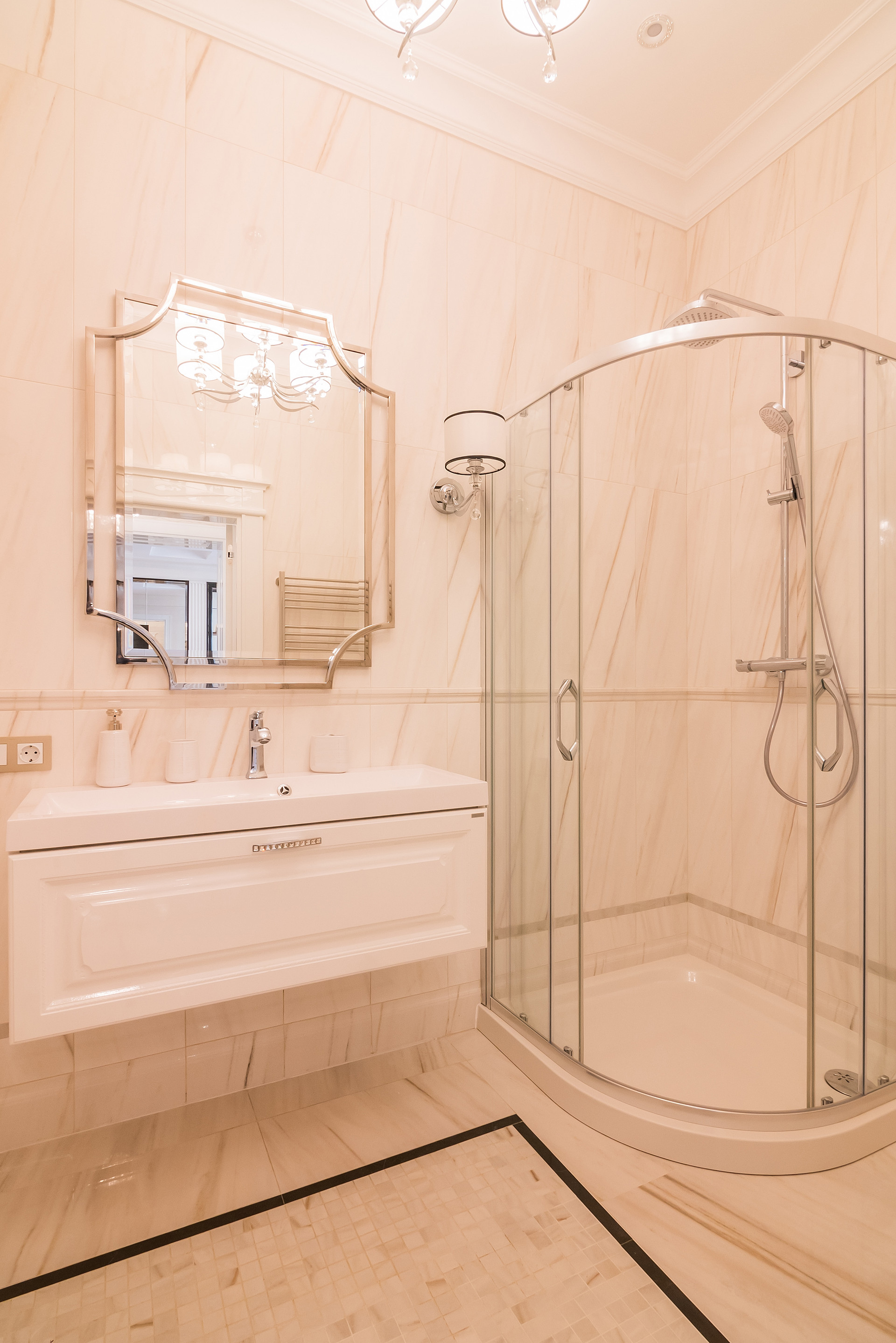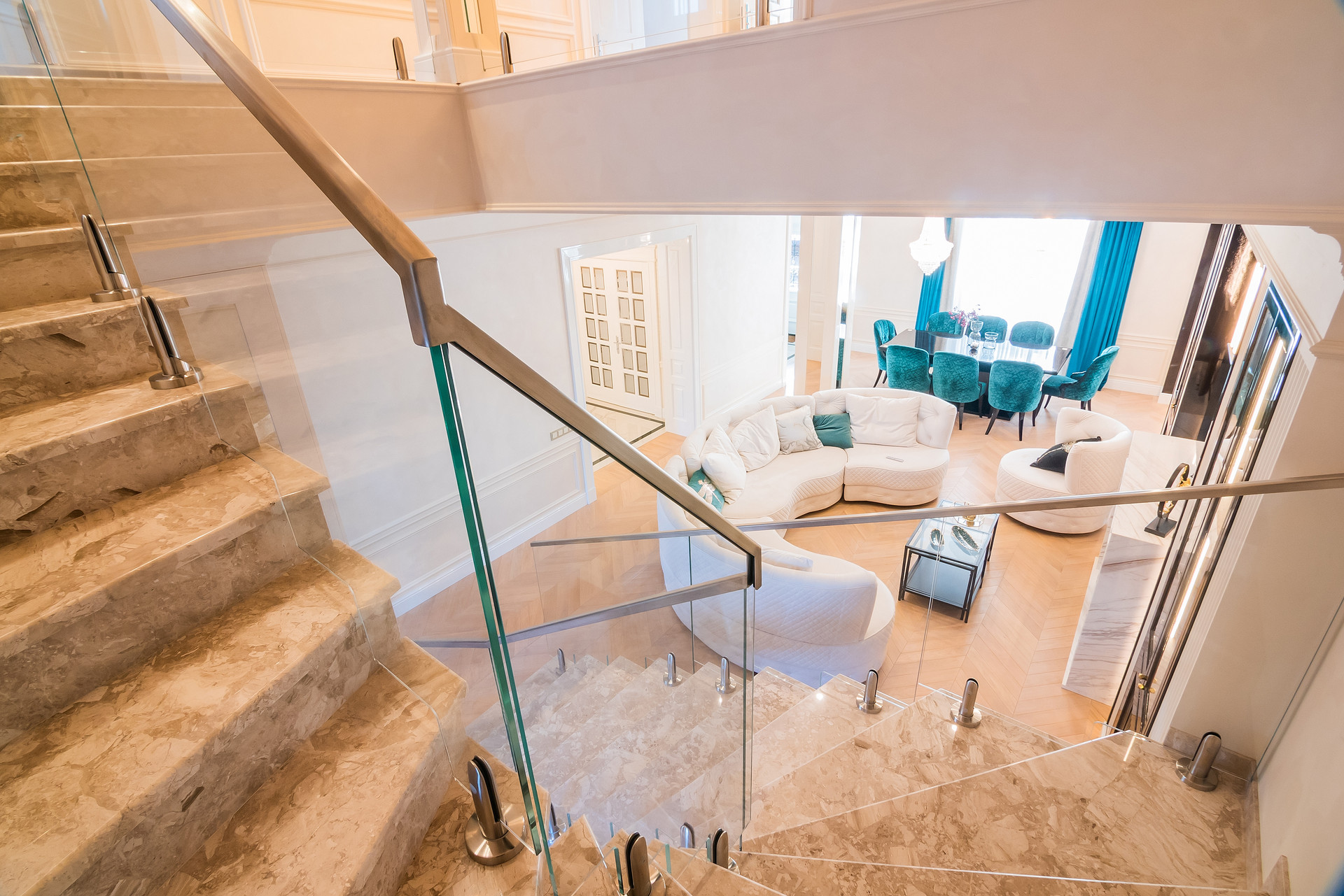 Лестница и подоконники -облицовка натуральным мрамором.