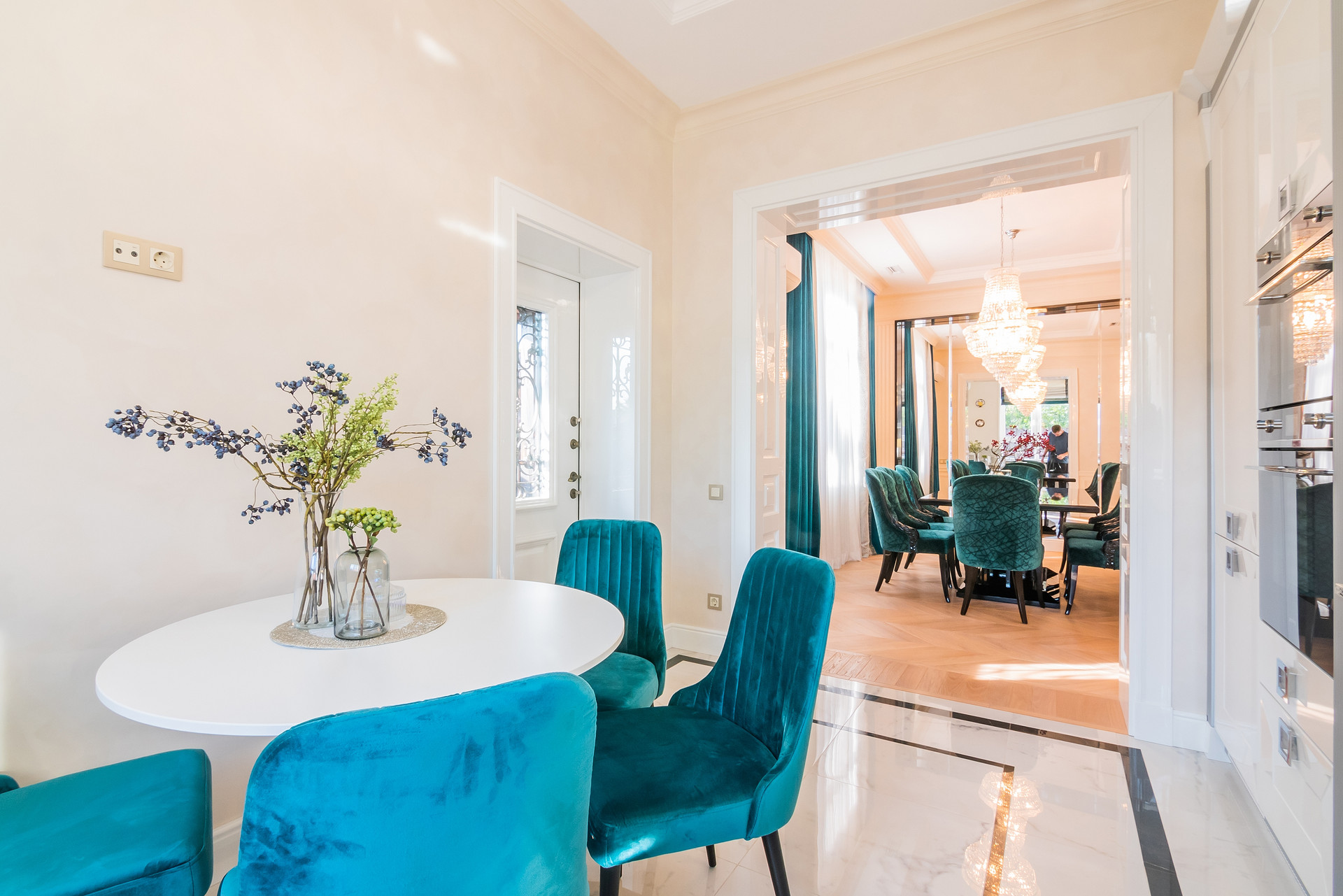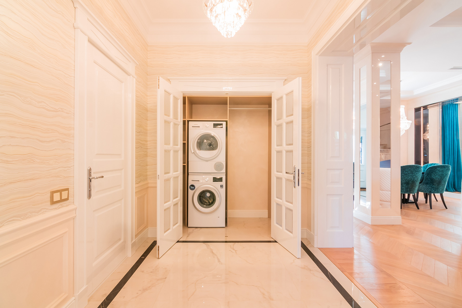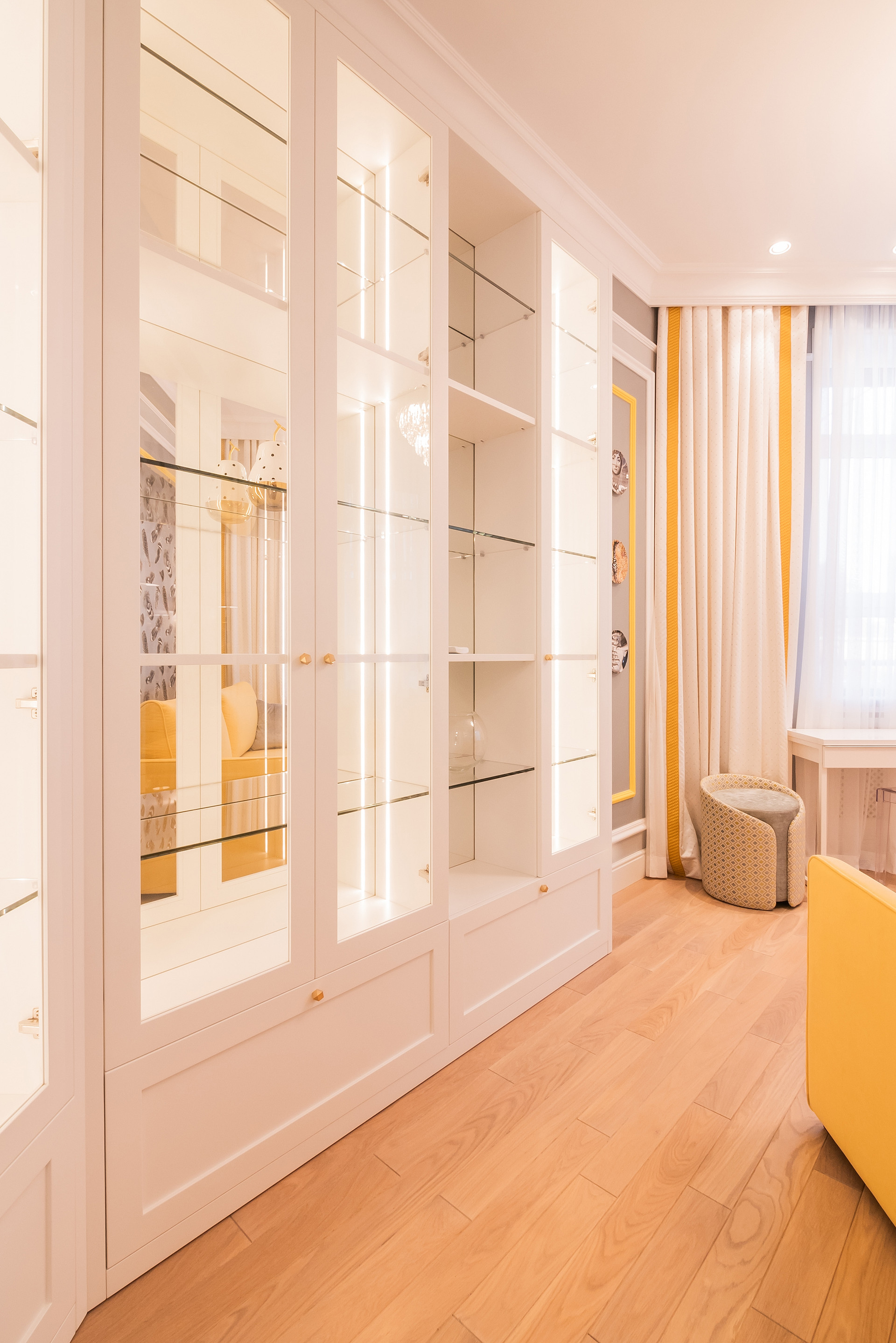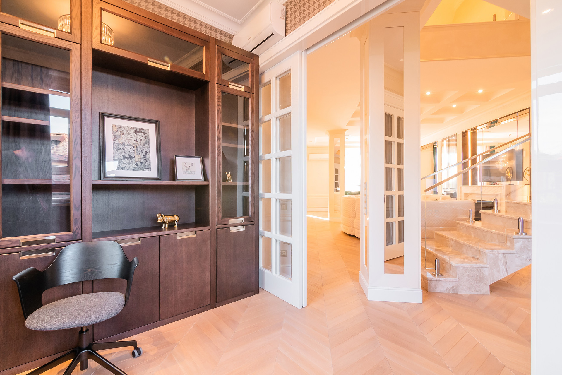 Встроенная мебель, двери, плинтуса , включая порталы выполнены в столярной мастерской по индивидуальному дизайну