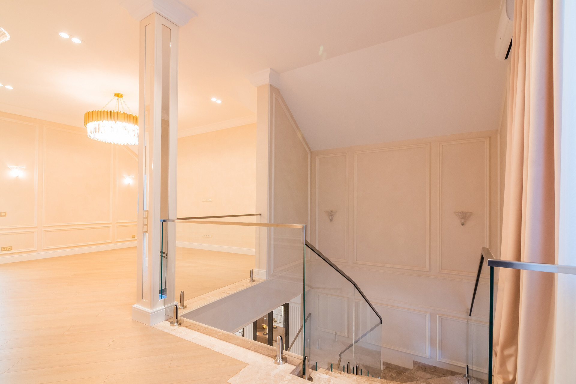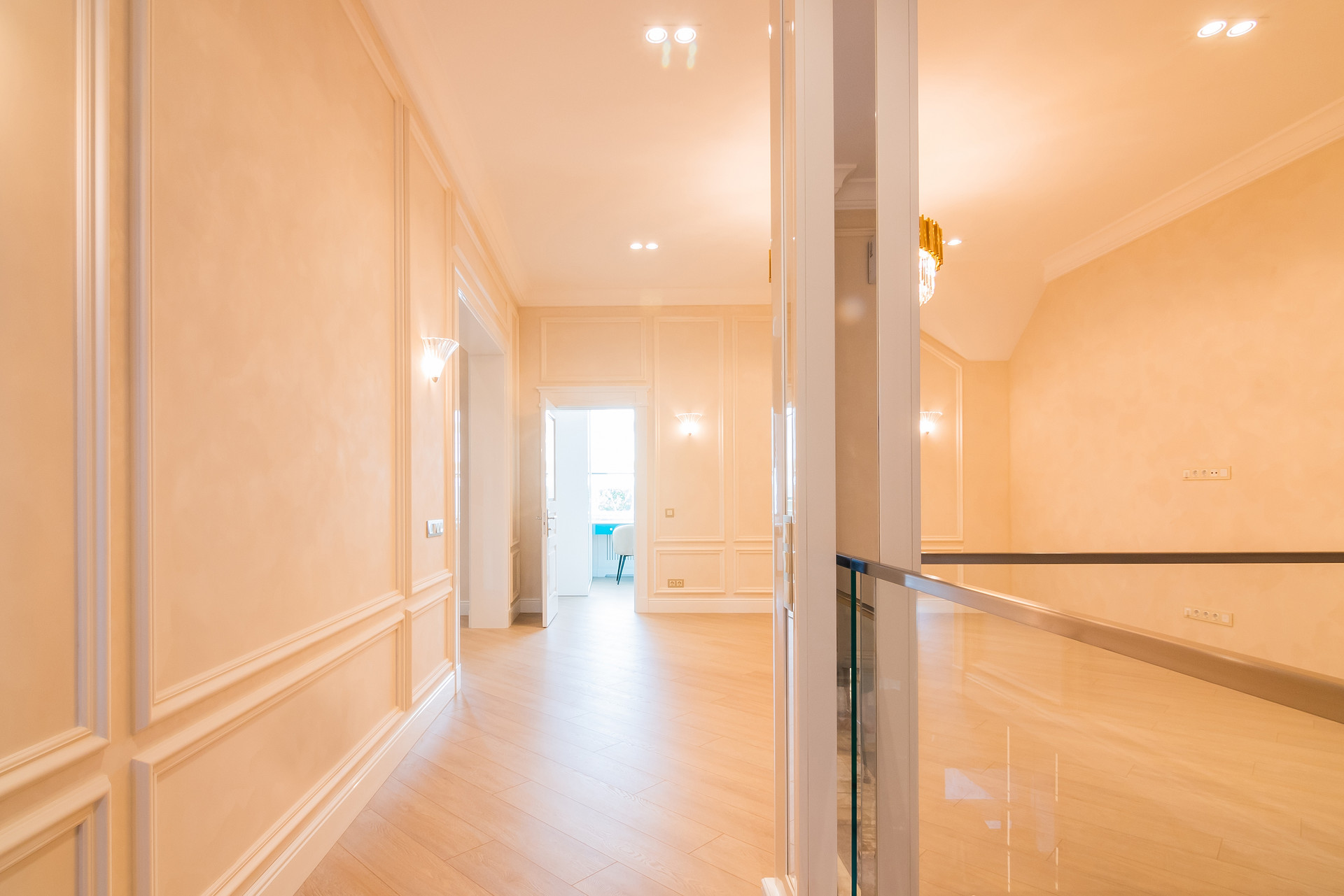 -2 этаж: выход с лестницы в просторный холл 42 кв.м, хозяйская спальня, детская спальня, просторная гардеробная, санузел, лоджия.