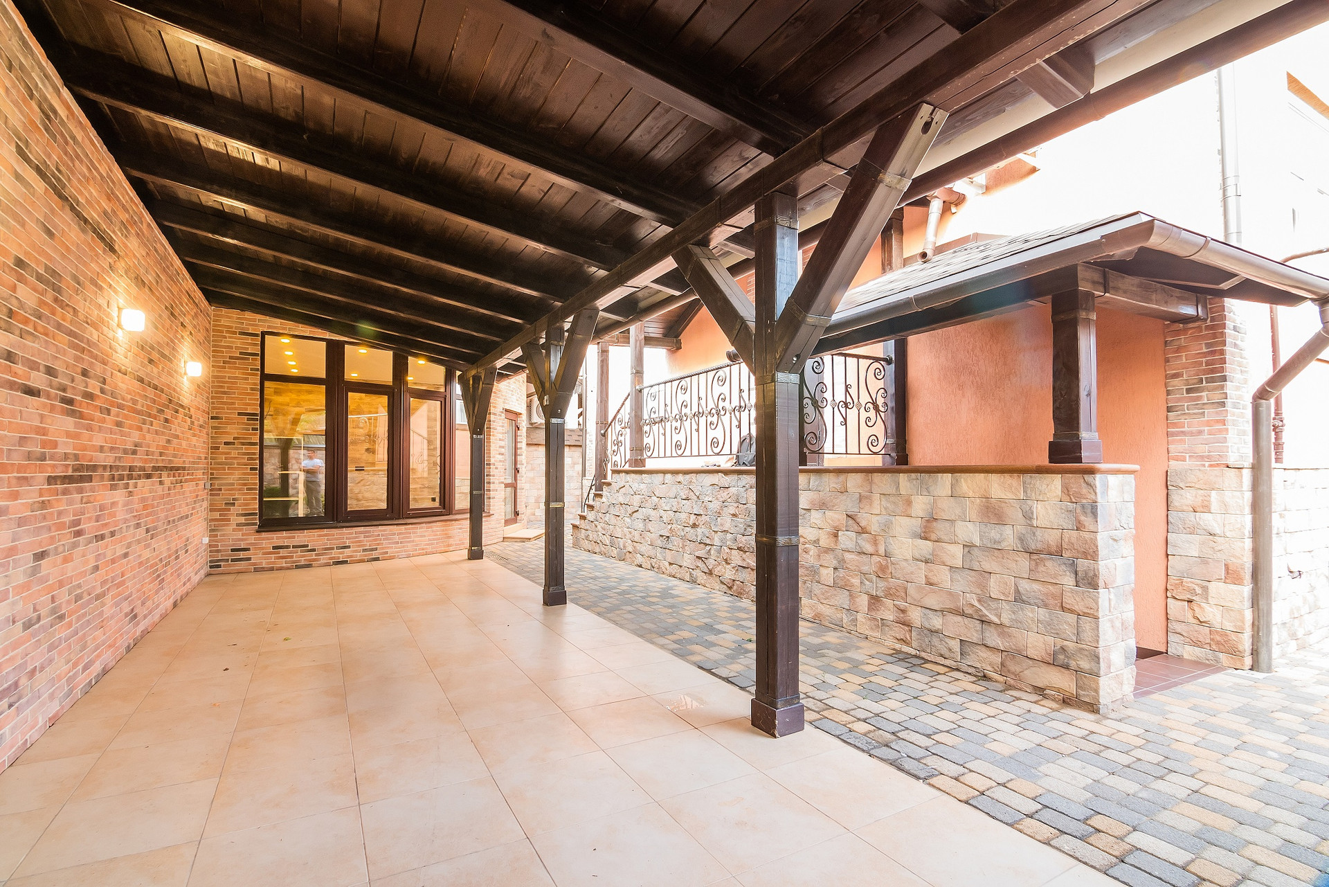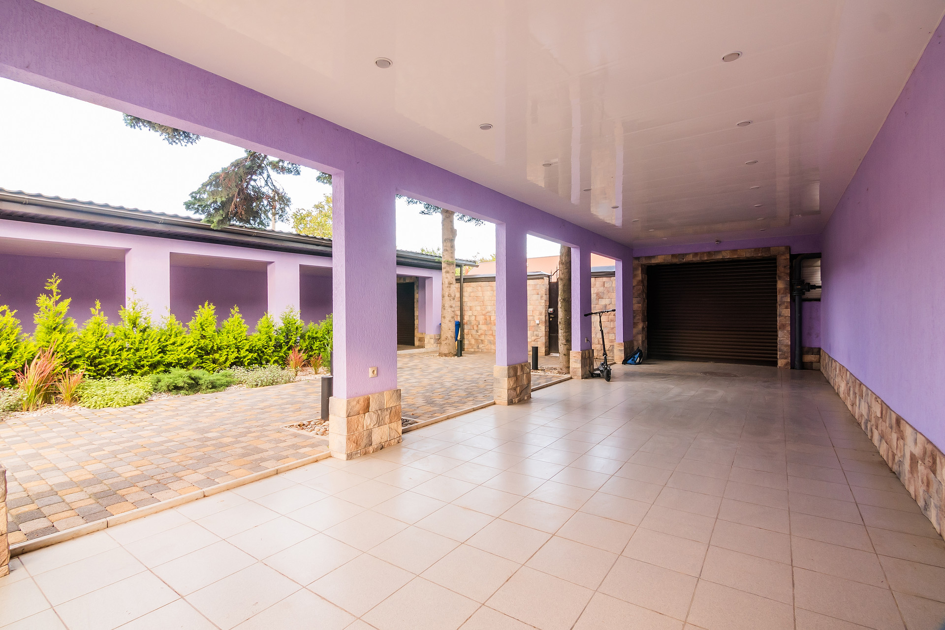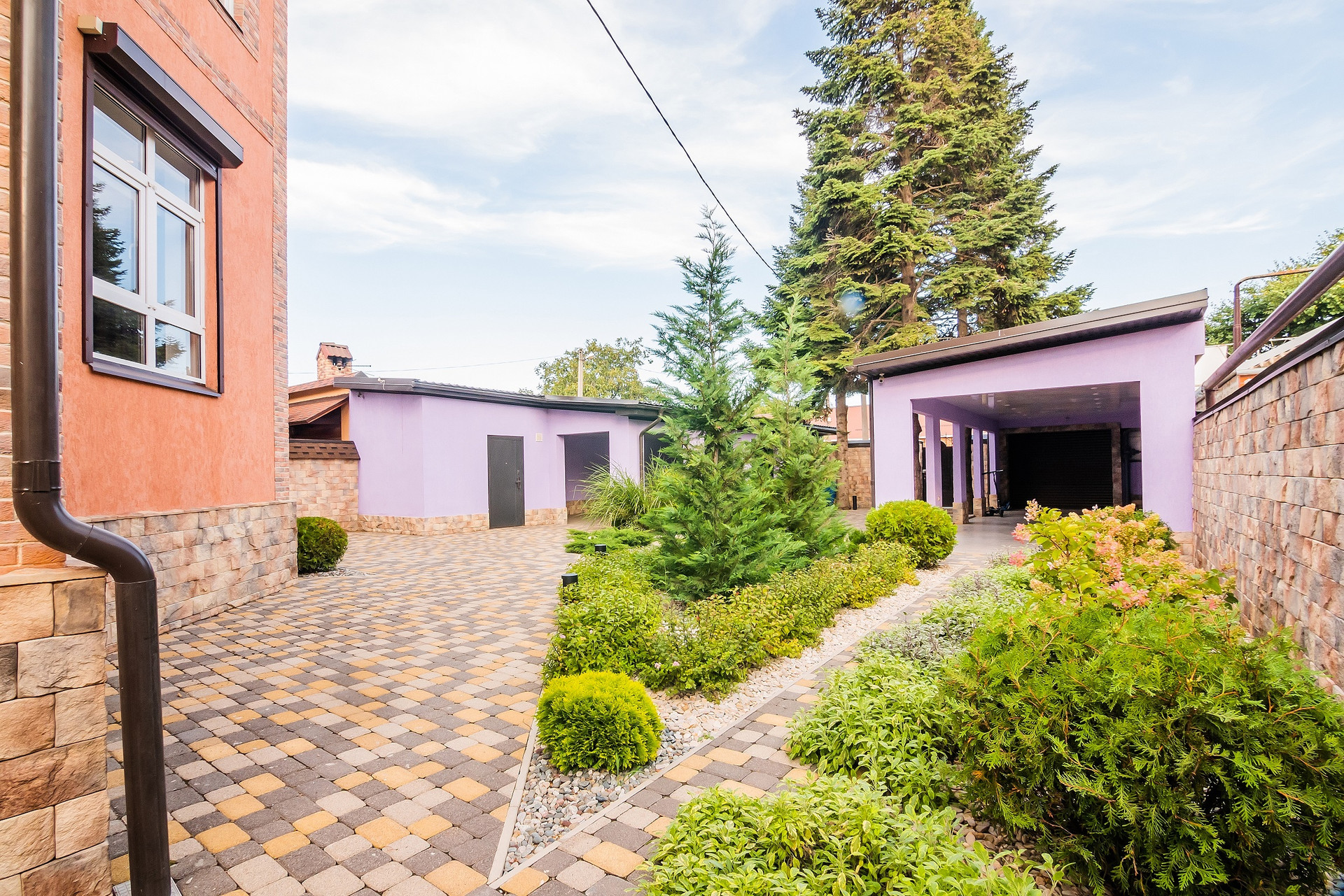 Двор с навесом , летней кухней , зоной отдыха и барбекю . Во дворе гостевой санузел. Два въезда с откатными роллетными воротами на 4 автомобиля, автопарковка под навесом с небольшим строением под хоз.нужды. Кирпичный забор перед домом. Во дворе по периметру весь высокий забор из камня.