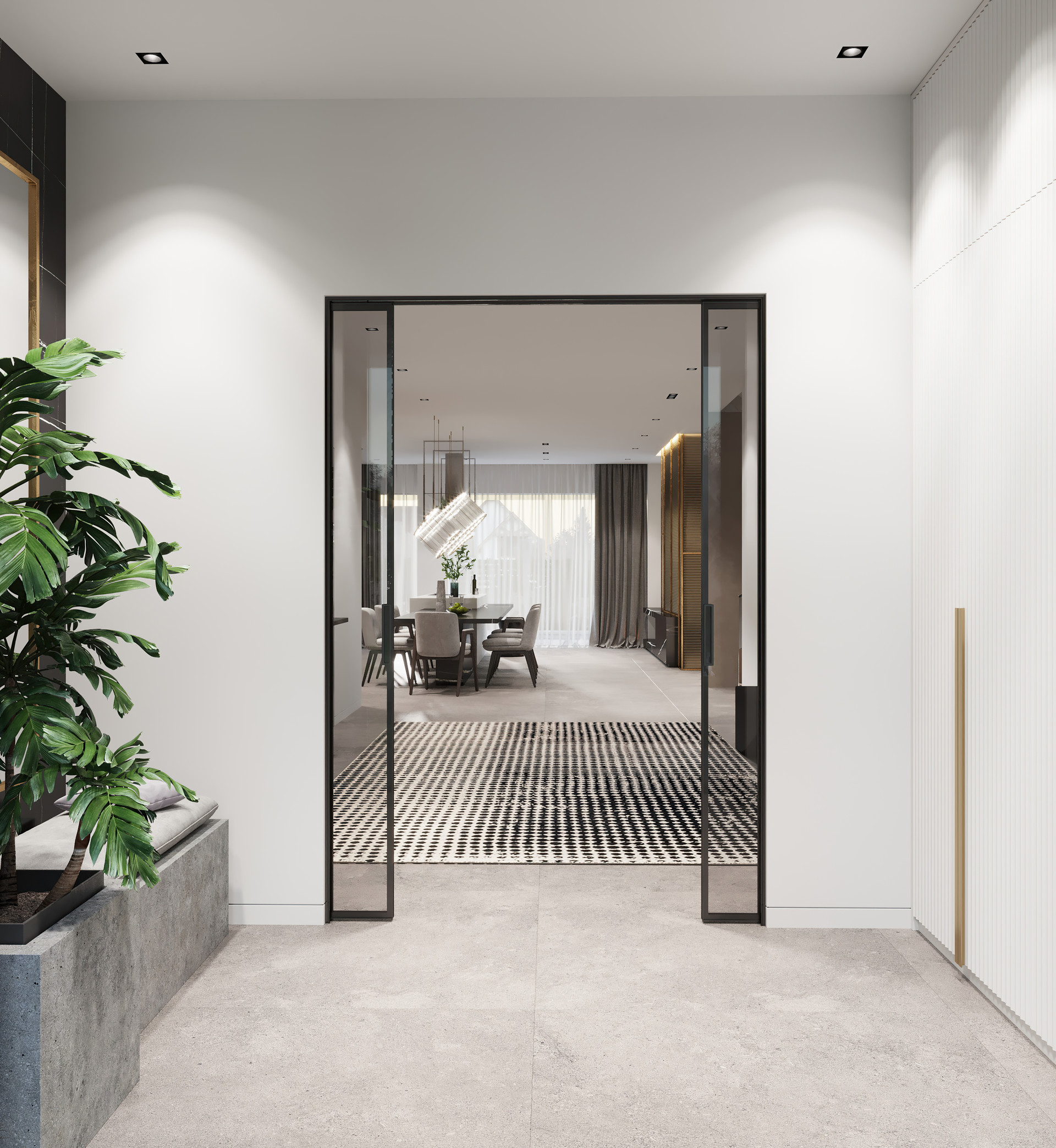 Первый этаж: кухня-гостиная с выходом к подогреваемому бассейну, дополнительная комната под хранение, спальня, гардероб, 2 сан.узла, кладовая, теплогенераторная и гараж, 2 просторных тамбура.