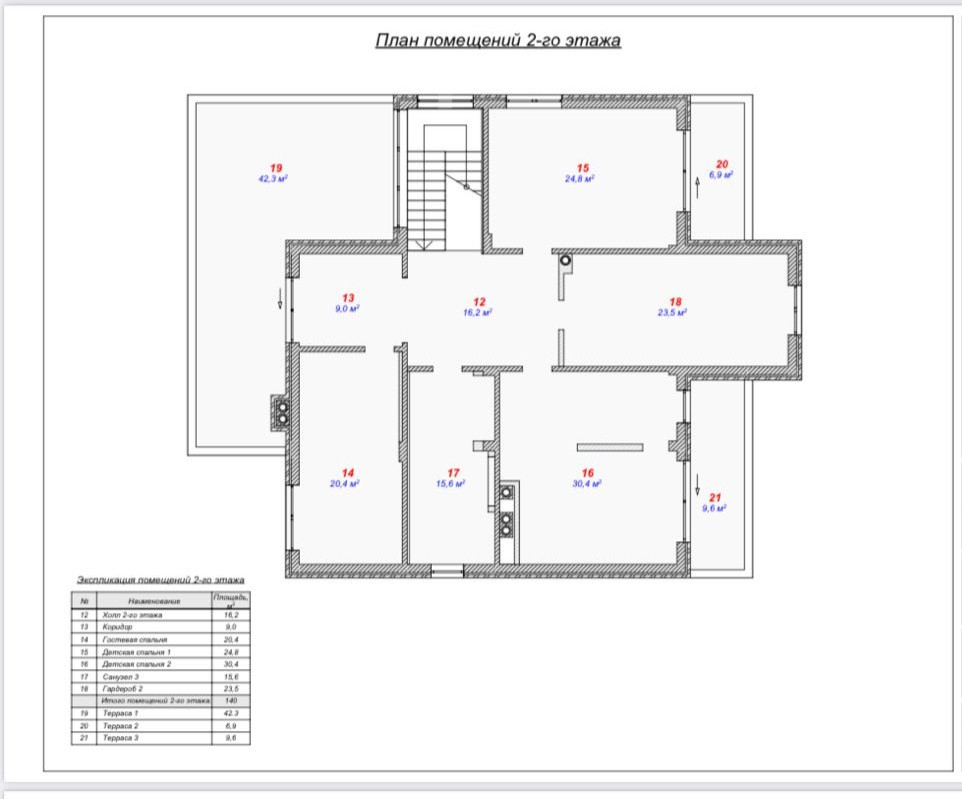 Второй этаж: 2 спальни с выходами на отдельные террасы, санузел, гардеробная, гостевая спальня и просторная терраса 42 метра.