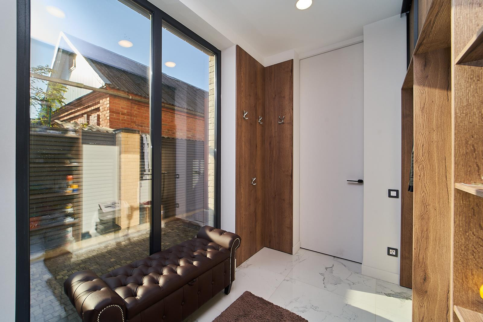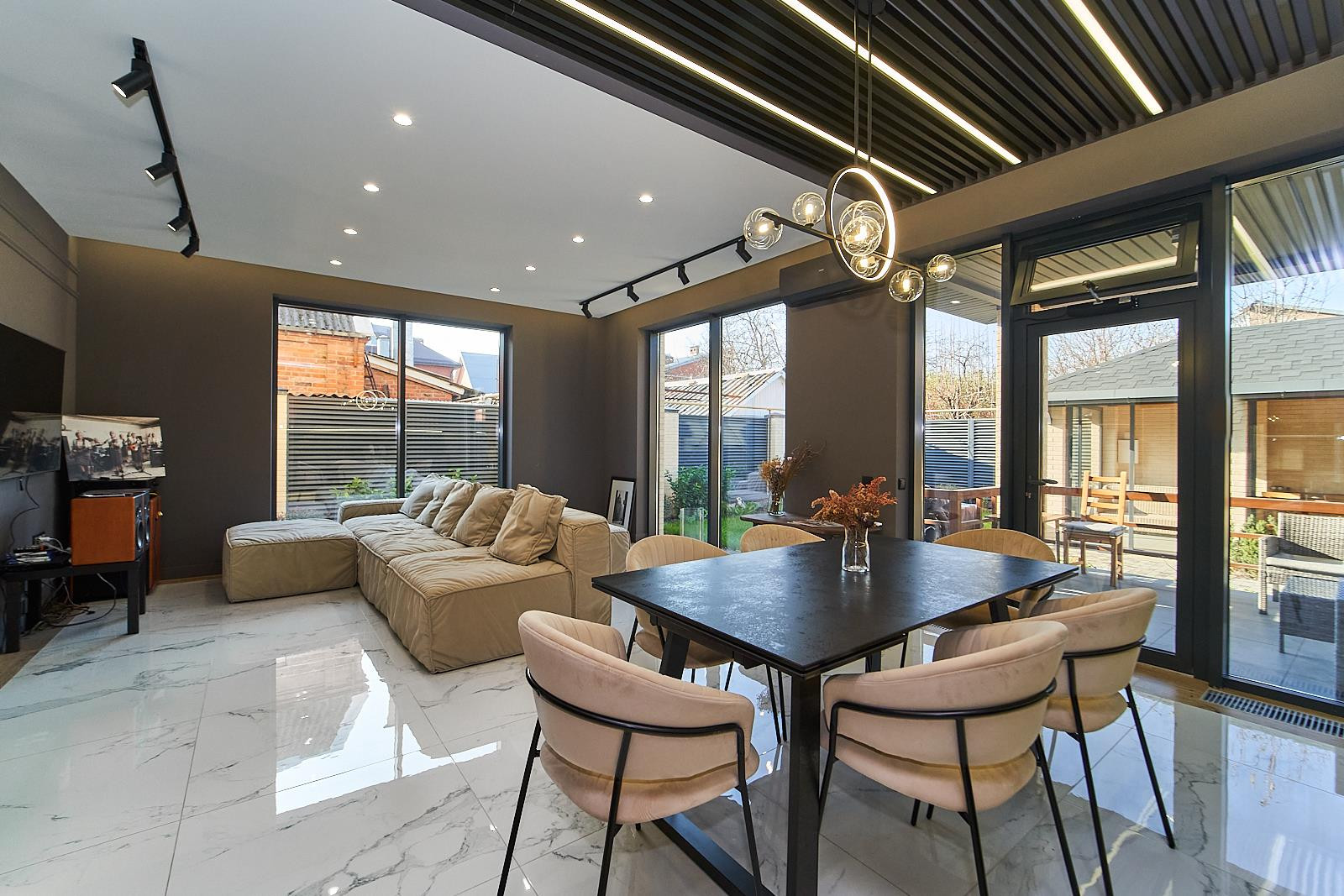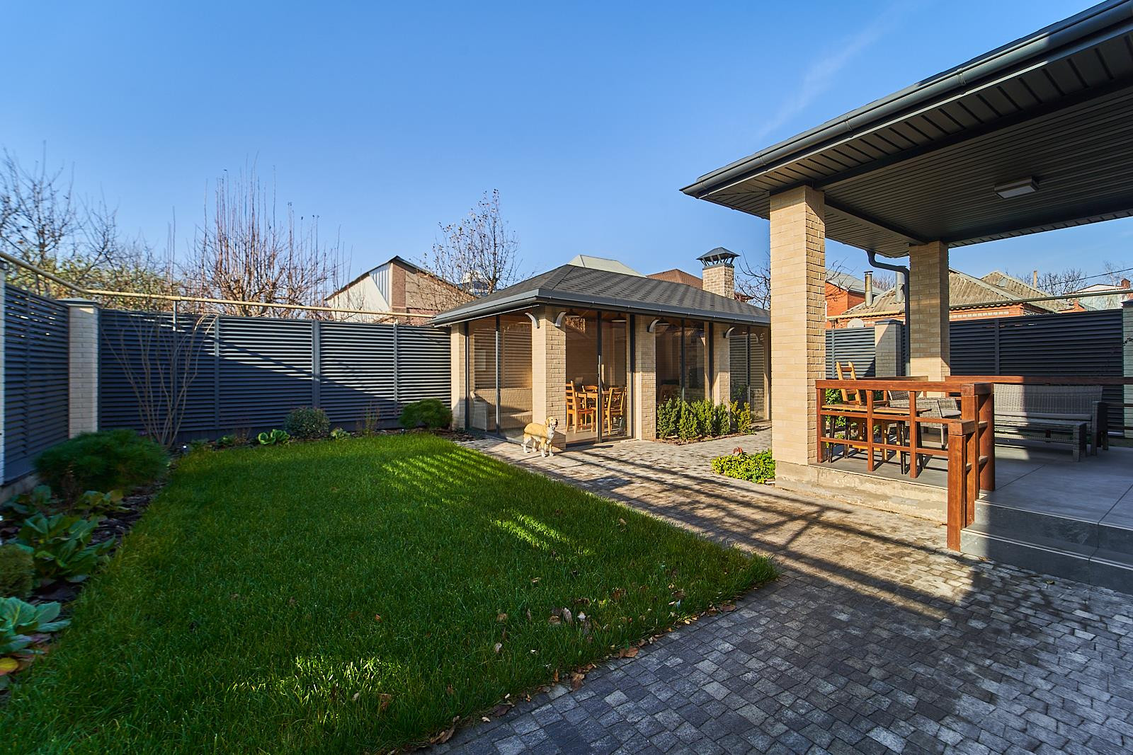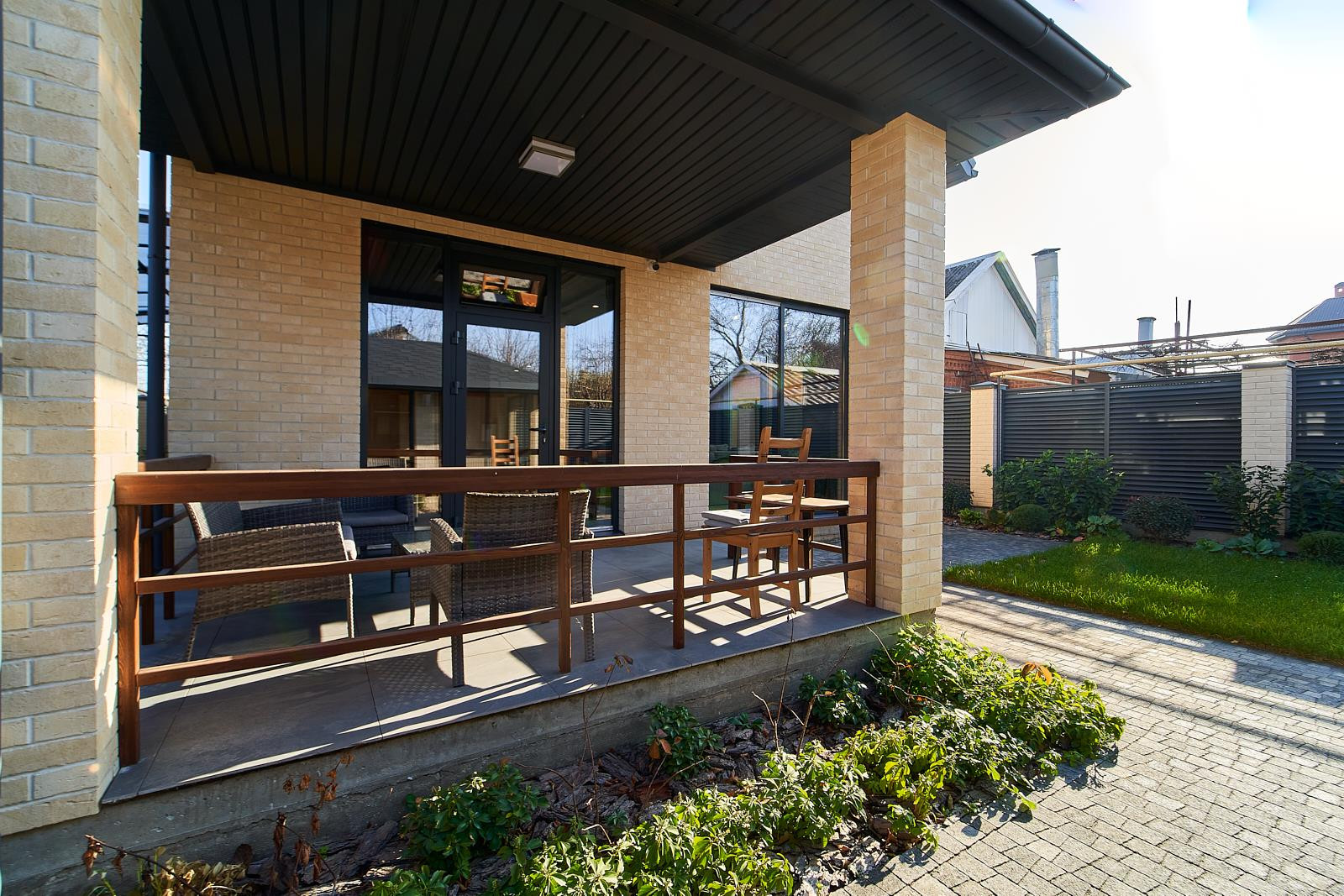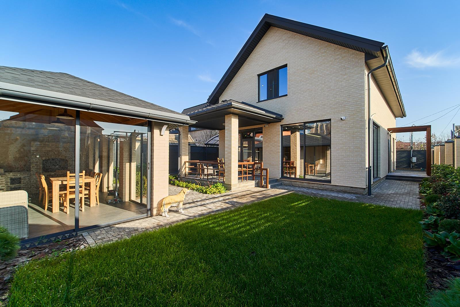 Витражные окна и двери добавляют современного стиля и легкости.