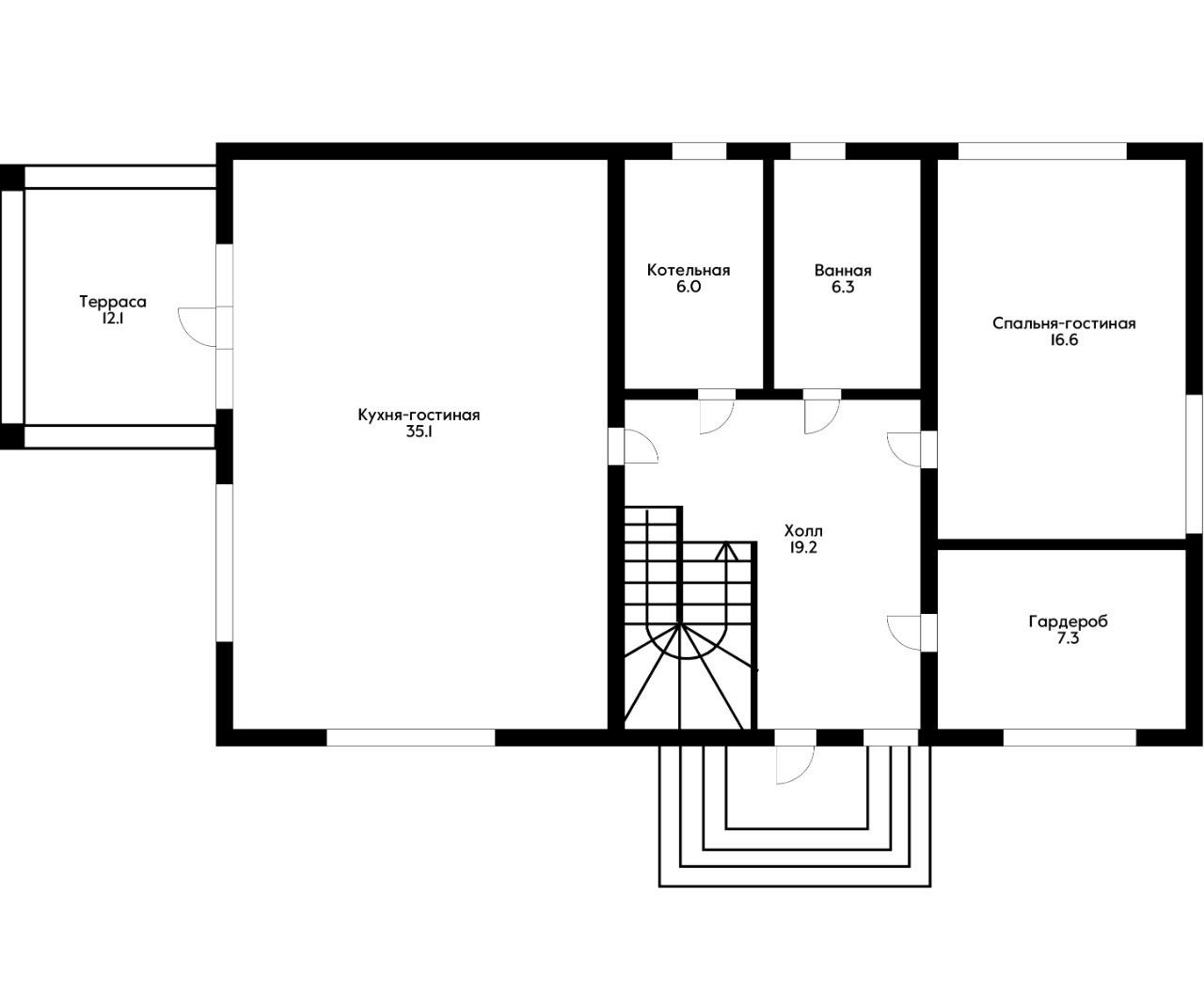 На первом этаже расположена, Большая кухня-гостиная с выходом на террасу, Спальня гостиная, гардеробная, Котельная(постирочная), Ванная комната, большой холл.