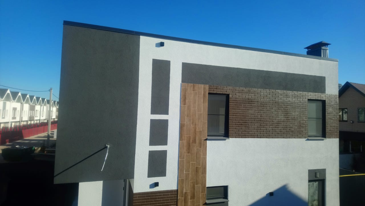 Дом построен по принципу монолита, стены из газоблока автоклавного твердения толщиной 45 см + утеплитель 5 см + штукатурка с покраской.