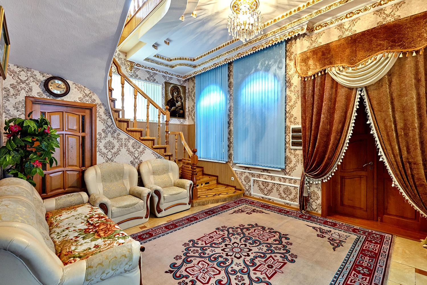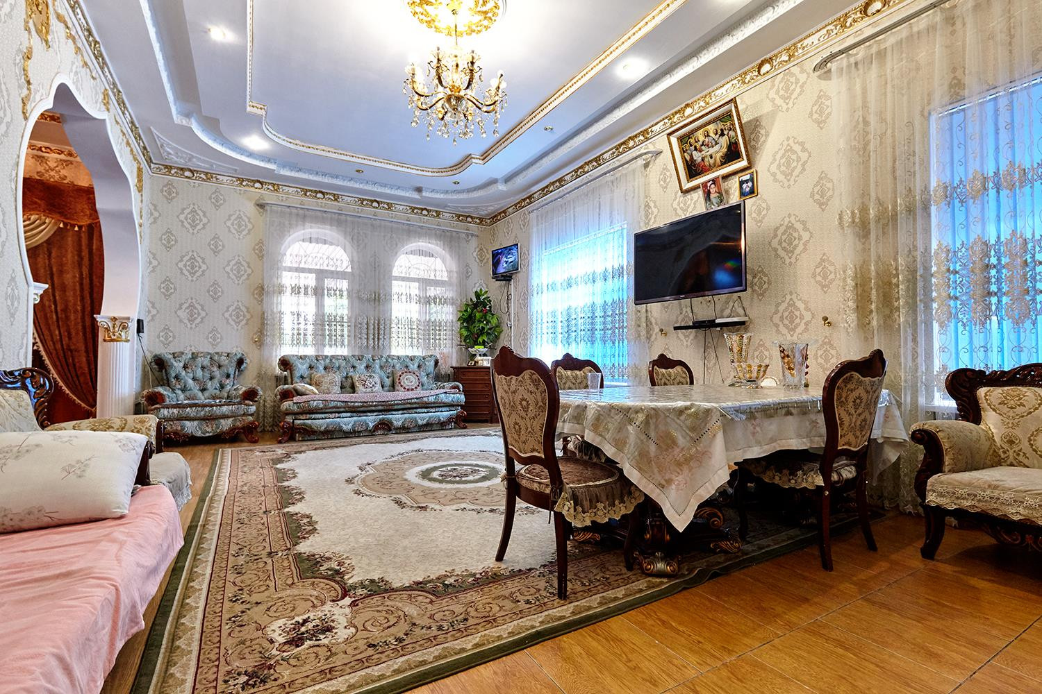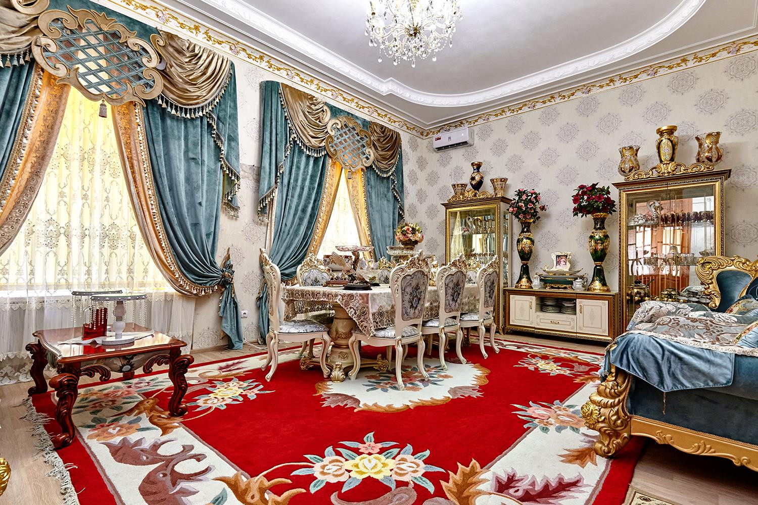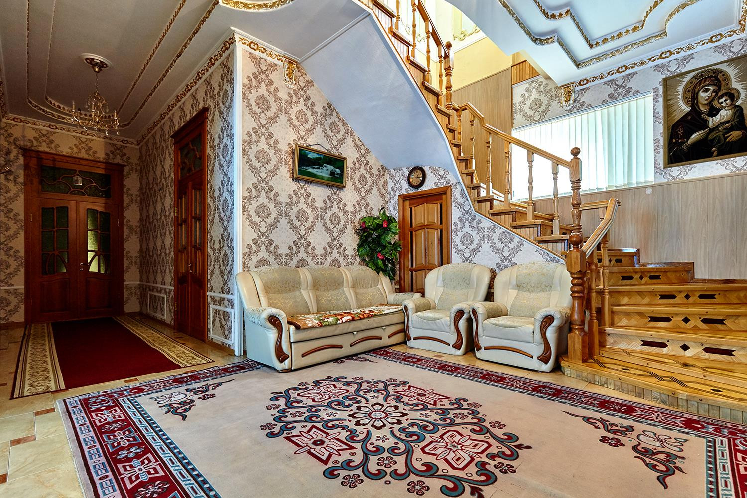 Отделка потолков художник рисовал в ручную сами потолки по 3.5 метра. Винтажная дорогая мебель в гостиной и спальне на 1 этаже. Установлен теплый пол. Расположен на земельном участке 4,4 сотки.