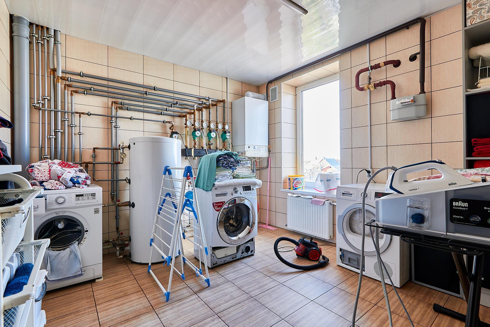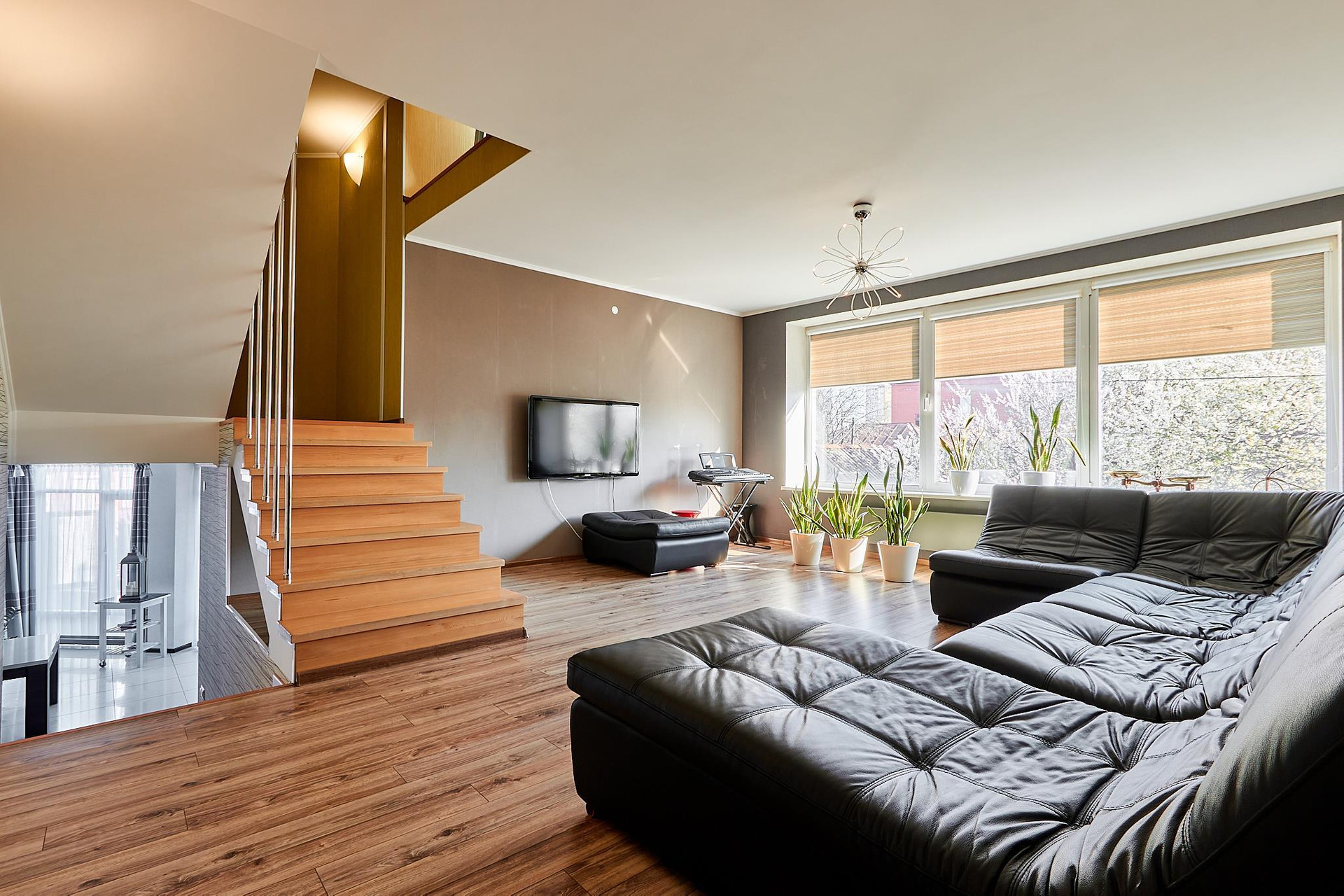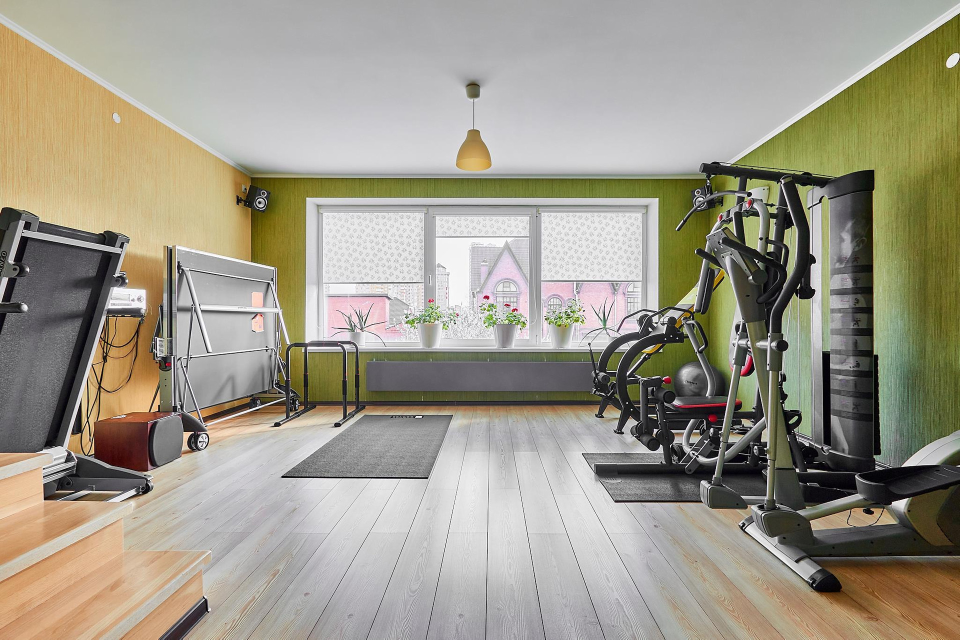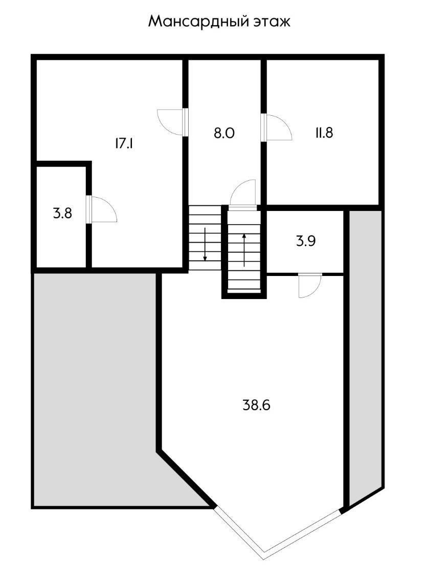 Две полноценные спальни со своими гардеробными и санузлами, два кабинета (можно переформатировать в спальни), зал, кухня-гостиная, тренажерный зал, помещение котельной, мансардный этаж.