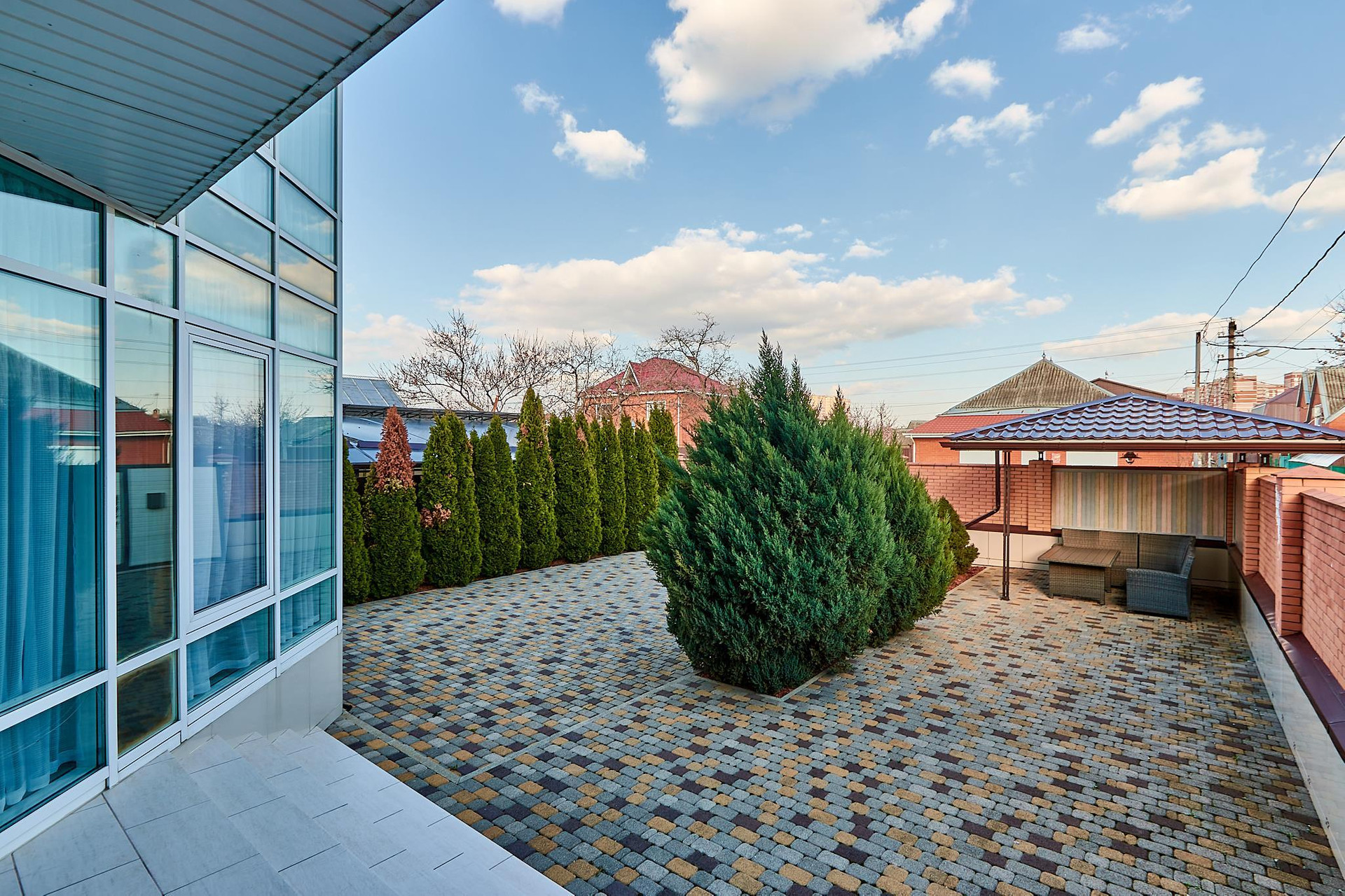 Угловой участок с зоной отчуждения. Есть место во дворе для оборудования мангальной зоны (коммуникации выедены). Отдельный заезд в гараж с проезда (просторный на 2-3 машины). Дом в 3 уровня с удобной лестницей. Грамотное планировочное решение, много света за счет витражного остекления.