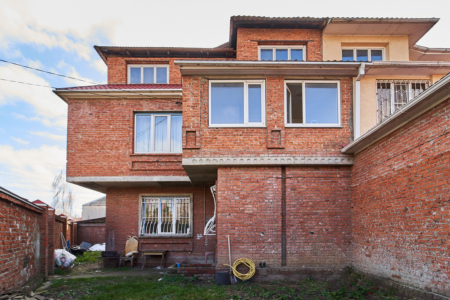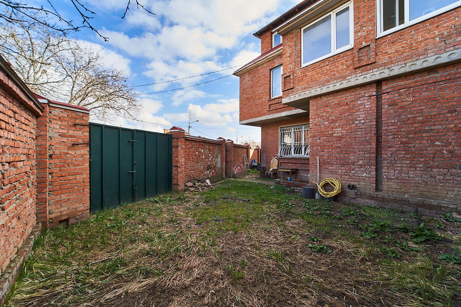 Дом огорожен красивым кирпичным забором с воротами и массивной входной дверью. Во дворе есть место для машины и мангала.