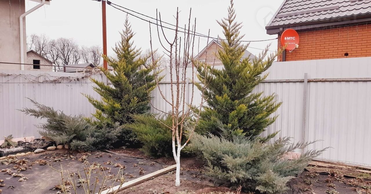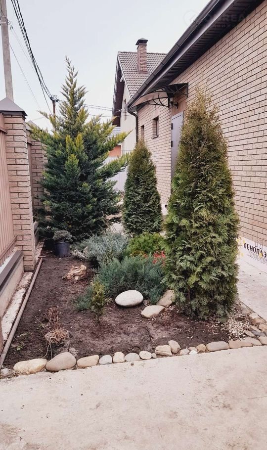 На участке плодовые деревья, малина, голубика, смородина, крыжовник, клубника. Газон, бетонированная площадка у второго выхода с кухни. Много хвойных растений, розарий.