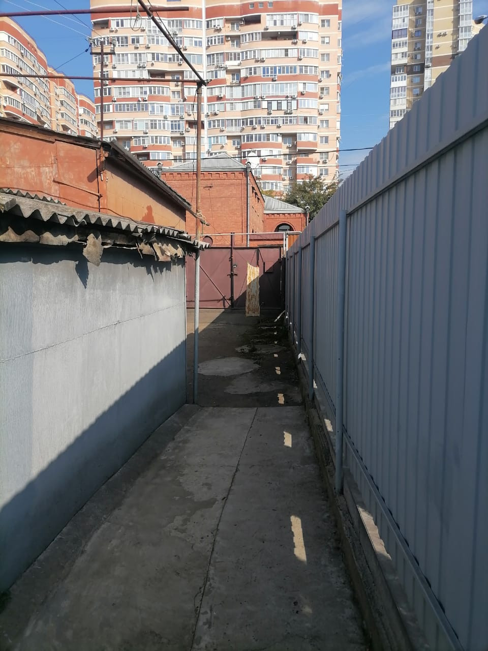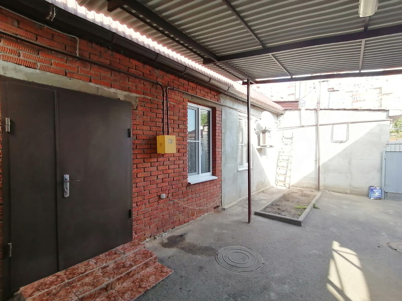 Общий со владельческий двор, но территория нашего участка закрыта примерно 1.1 сотки со своим въездом и небольшим двором .