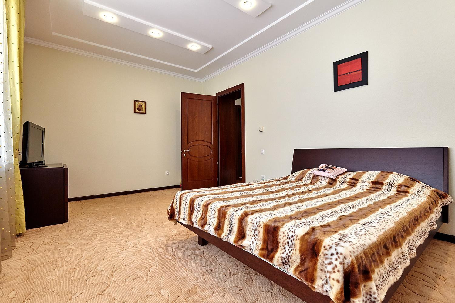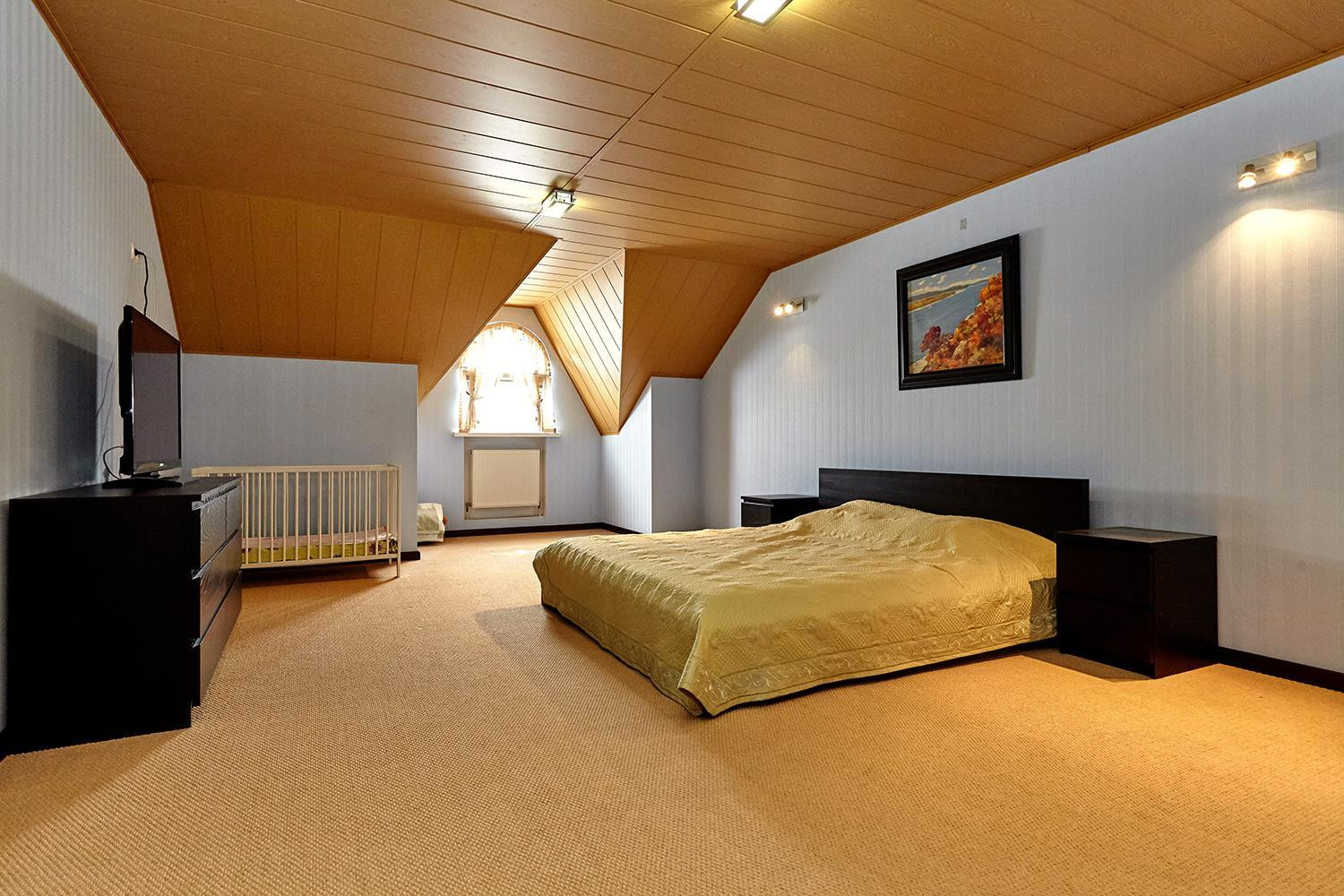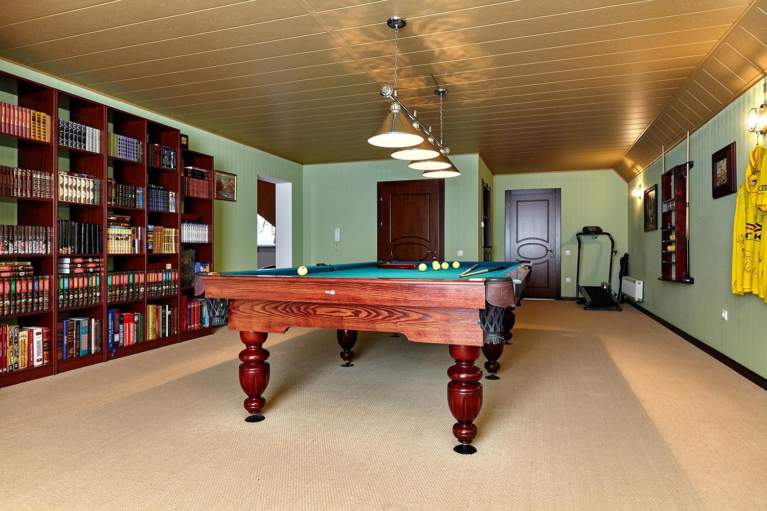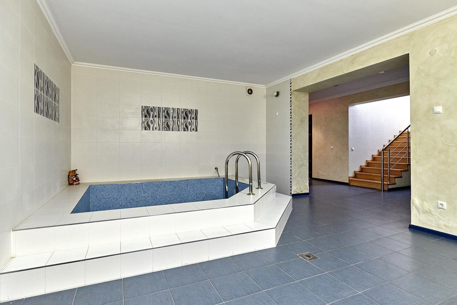 В доме: большой зал ; 6 изолированных спален: спальни по площади более 25 м², четыре санузла; кухня, столовая, гостиная, а также расположенные в цоколе здания сауна, бассейн, котельная с системой фильтрации и подготовки воды, и гараж на 2 автомобиля с автоматическим приводом ворот.