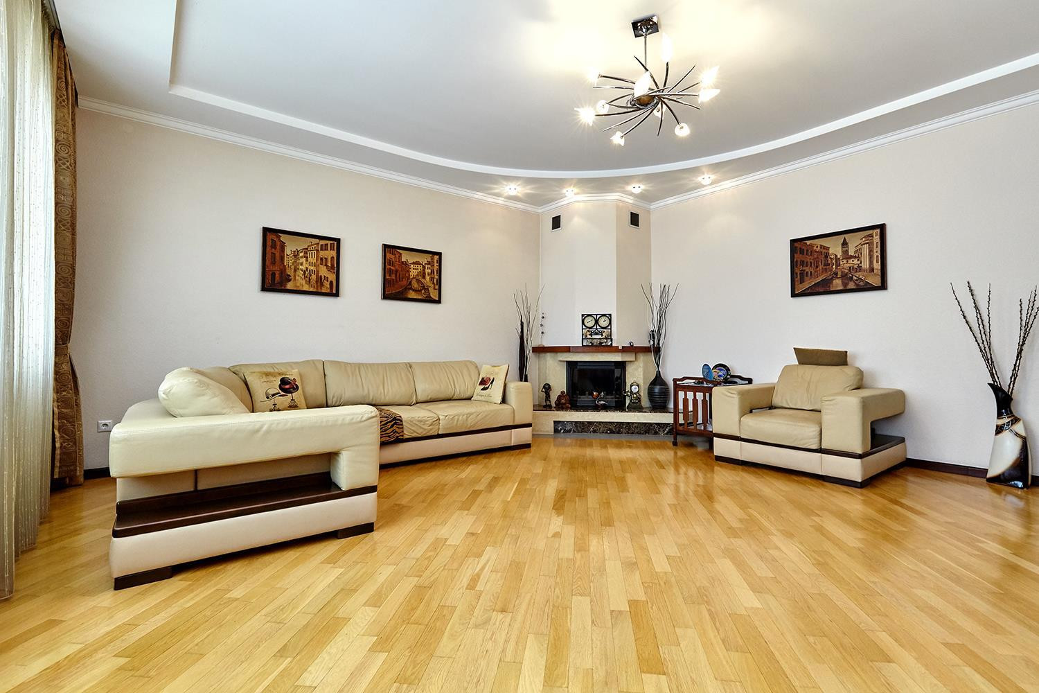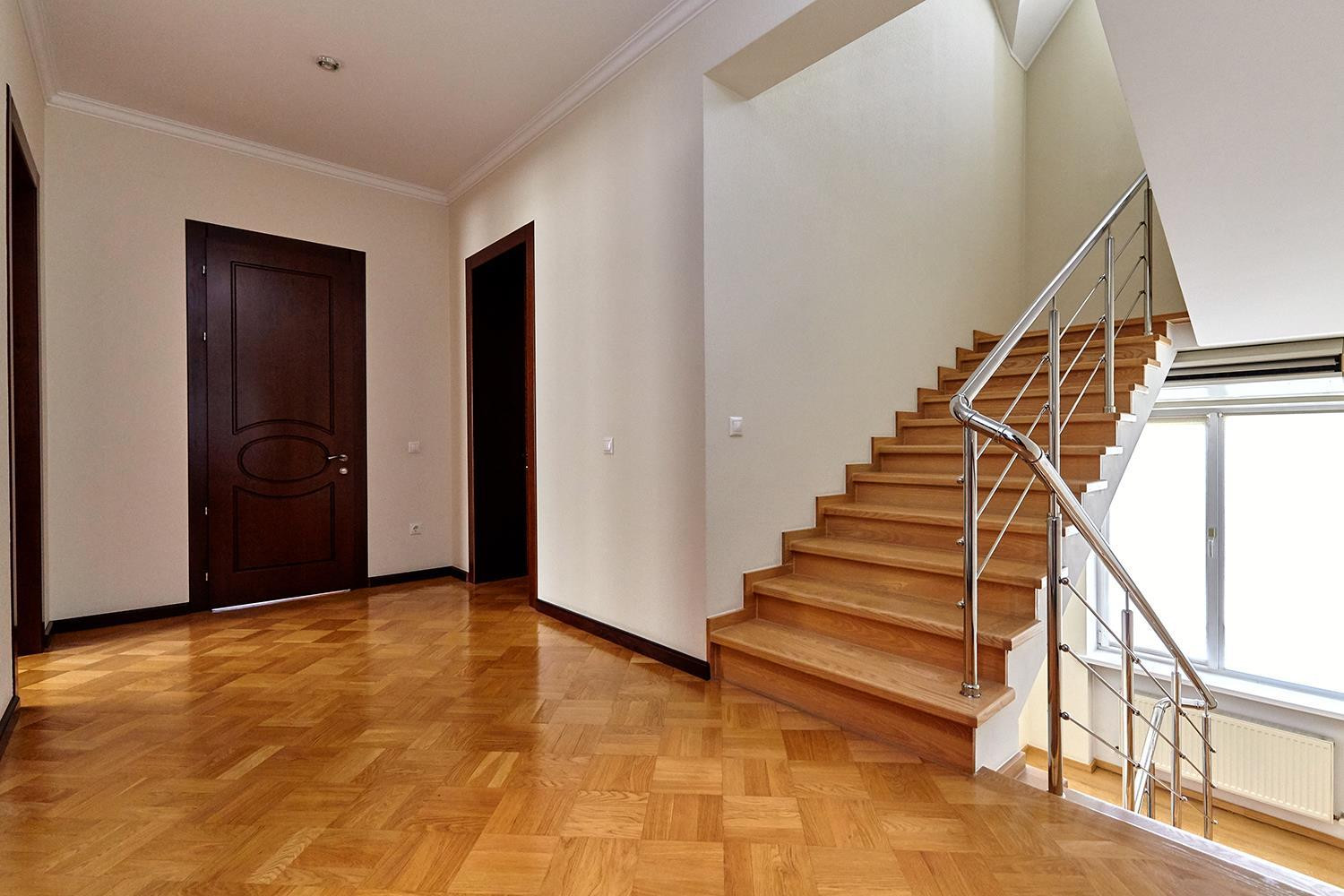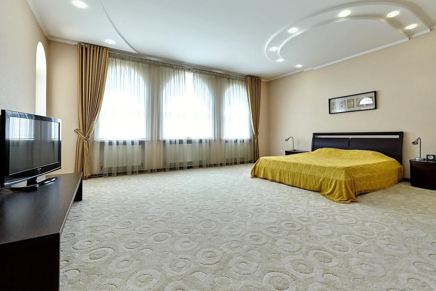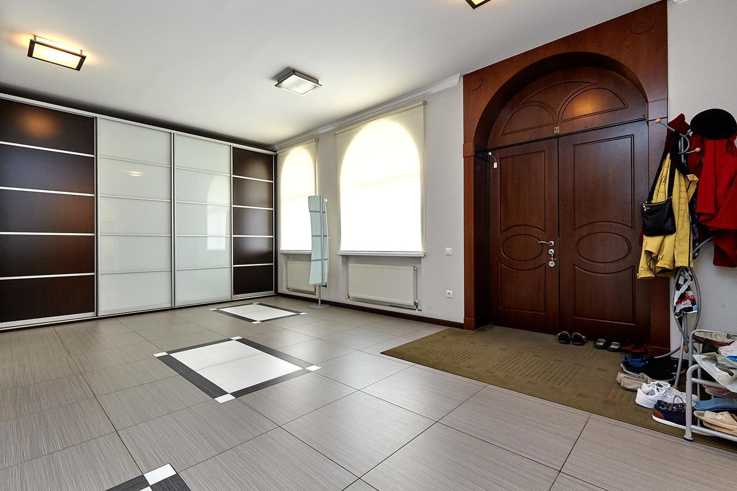В доме: большой зал ; 6 изолированных спален: спальни по площади более 25 м², четыре санузла; кухня, столовая, гостиная, а также расположенные в цоколе здания сауна, бассейн, котельная с системой фильтрации и подготовки воды, и гараж на 2 автомобиля с автоматическим приводом ворот.