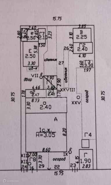 Фасад 15.75, глубина 30,75. площадь участка 4,85 сот.