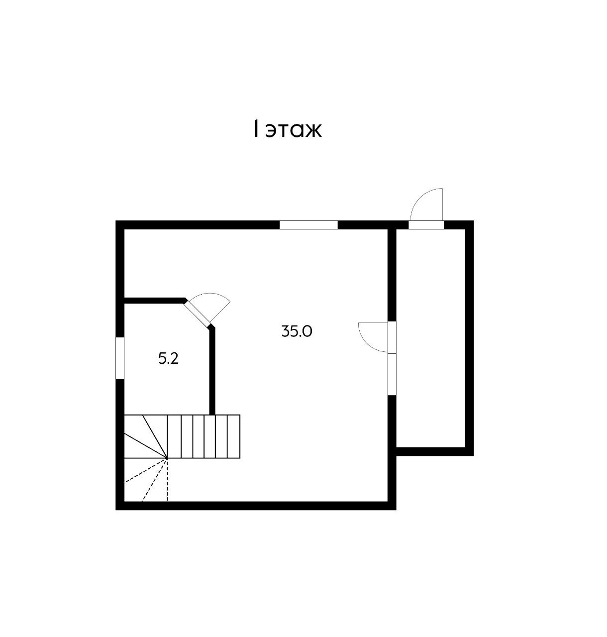 Первый этаж начинается с холла-прихожей, ведущей в просторную гостиную. Кухня и столовая объединены в единое пространство.  Просторный санузел. Кладовка.