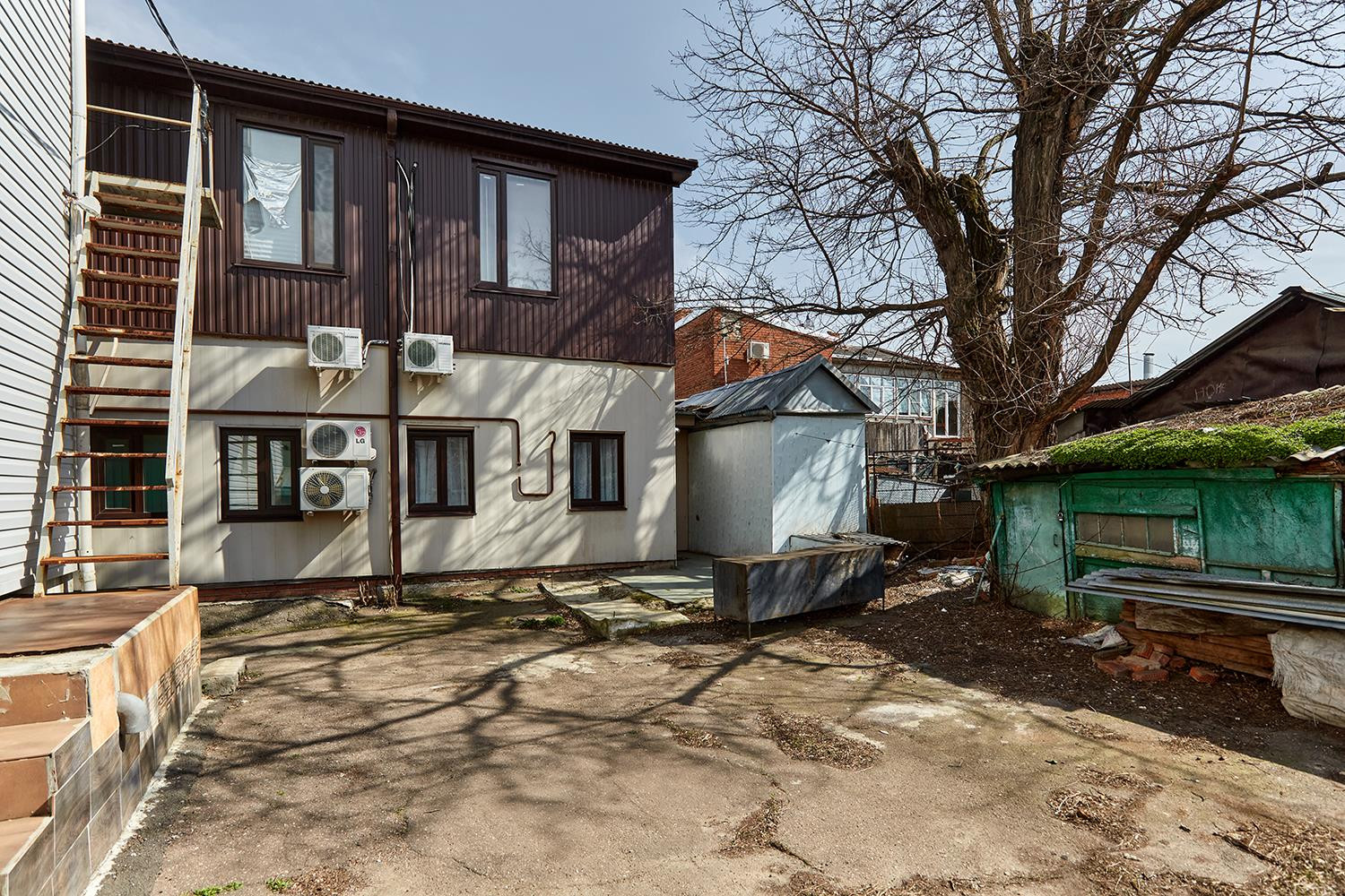 На участке находится: 2 этажное коммерческое помещение 94 м (сдано в аренду), имеет 2 входа, есть помещение для склада, есть кабинеты, на каждом этаже свой с/у; за зданием находится жилой дом состоящий из большой комнаты, кухни, с/у - сдан в аренду. Все коммуникации центральные.
